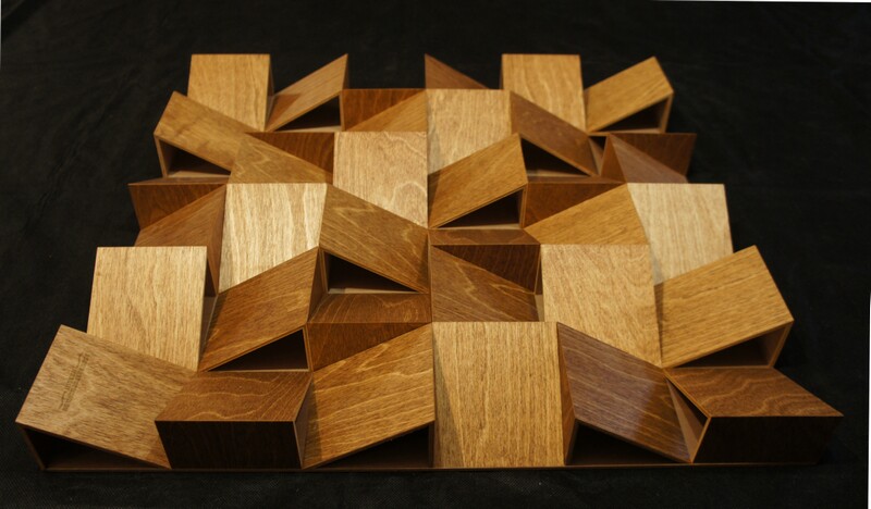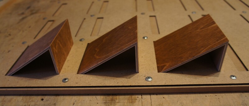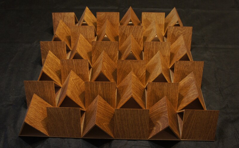 Панели представляют из себя «пирамидки» с основанием 100х100 мм (этот размер может быть любым другим и это скажется на рабочем диапазоне панели, но как именно скажется рассказать не смогу) …пирамидки крепятся к основе из той же 4-мм фанеры размером 600х600 мм (распространённый строительный шаг, он конечно, тоже может быть любым другим)