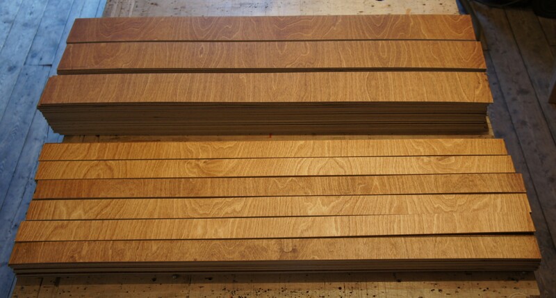 Фанеру шлифуем и красим, затем режем на полосы. Для потолочных деталей ширина полос 100 мм, для стеновых они разные – 57,5 и 115,5 мм.