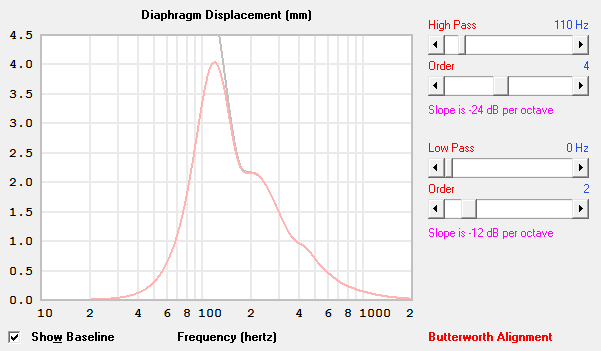 ФНЧ позволяет некоторую вольность, но практически с любым разумным порядком его нельзя настраивать ниже 110 Гц - неизбежный выход катушки за пределы линейного хода уже на достаточно скромной AES мощности динамика.