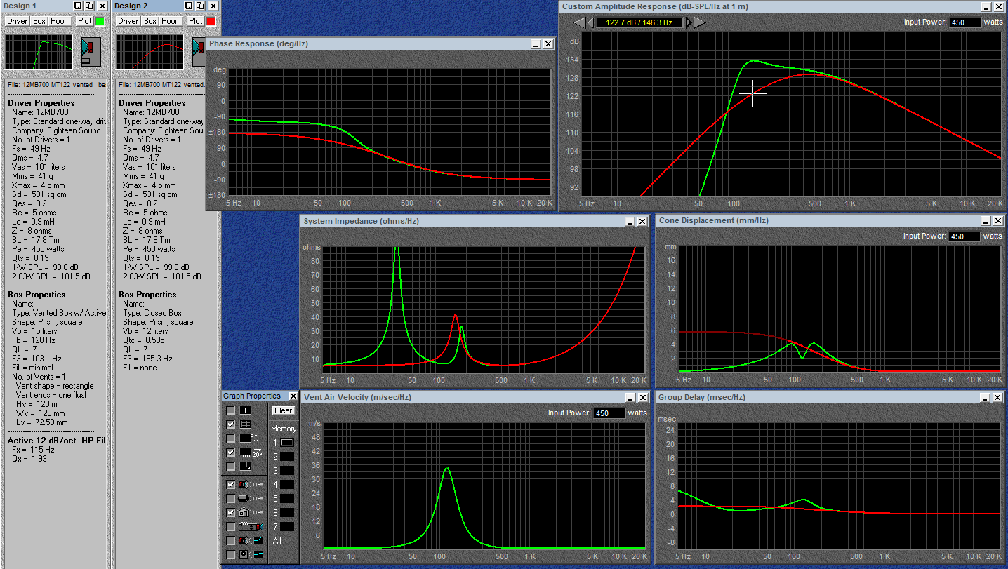 Красный цвет - динамик в тесном для него закрытом 12-литровом ящике.