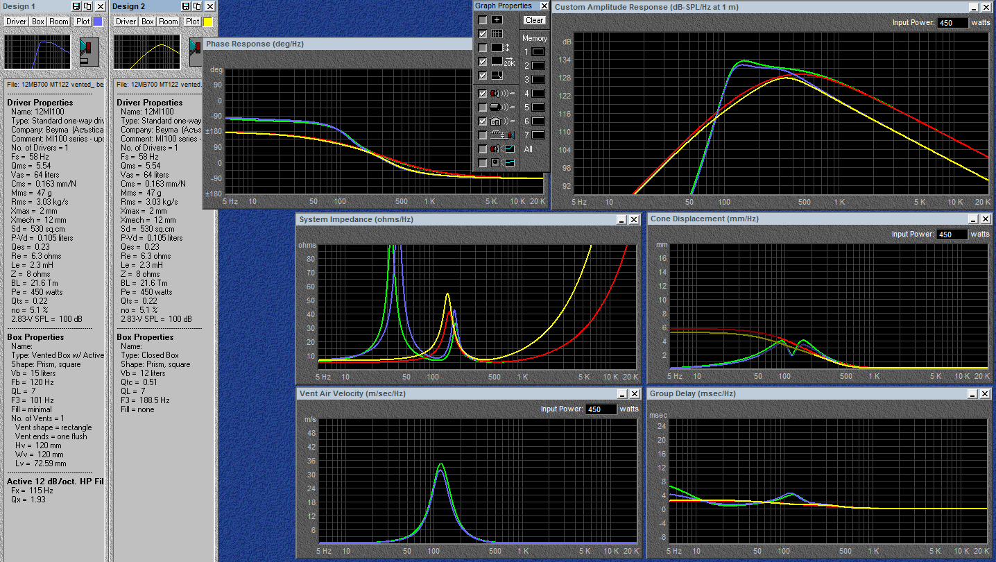Зеленый цвет - немного оптимизированный фазоинвертор. Оптимизации были нацелены на вытягивание возможно большей отдачи конкретно от этого динамика и требуют корректировки для других. Но не суть, +- полсапога добавление ФИ будет актуально для сдерживания хода подвижки и увеличения отдачи любого другого динамика. Параметры ящика выбраны и нарисованы на графиках уже с учетом фильтра второго порядка, настроенного на частоту 95 Гц.