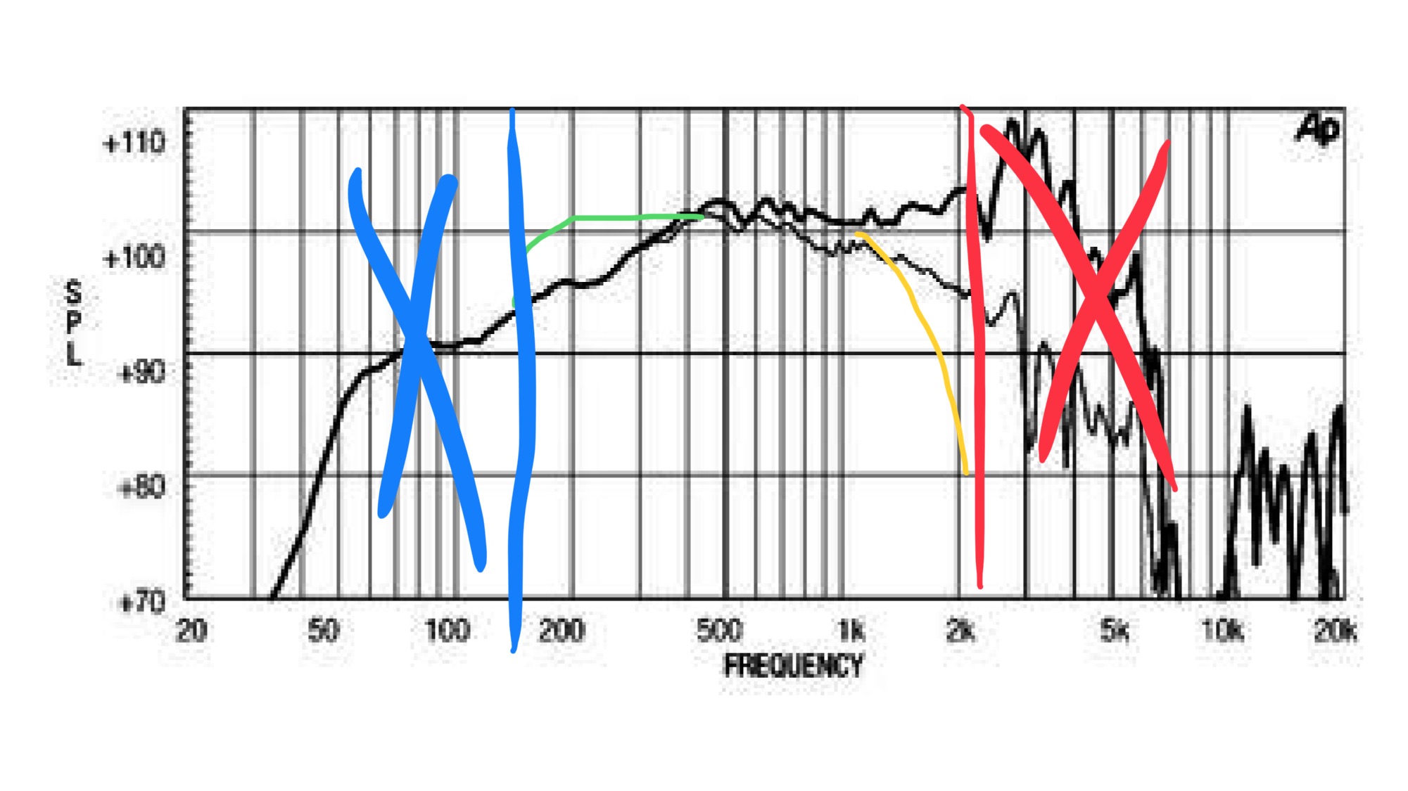 Желтый спад - позволяет комфортно свести дин с большим (а даже и с маленьким, но класс не тот) пищем, а заодно беспроблемно отыграть третью-вторую гармошку от рабочего диапазона. Обратите внимание на честно приведенную внеосевую, причем для 12” очень и очень хорошую.