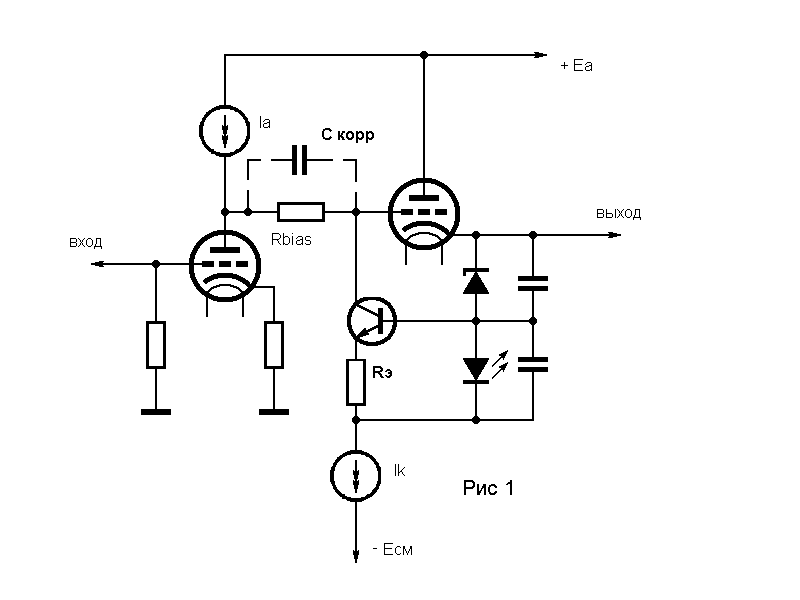 Упрощаем дальше (рис 1): верхняя лампа - усилитель УН, нижняя - источник тока (без конденсатора в катоде) - просто противовес.