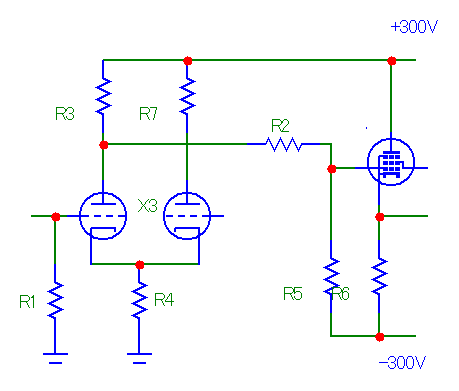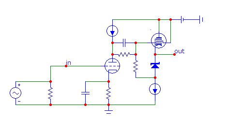Да , так уже проще ... но всё-таки , применяются же транзисторы . А можно просто "сложить пополам" обычный SRPP - то есть , вместо одного источника питания +400 , например - сделать 2 по 200 , и включить всё последовательно - лампа , батарея , лампа , батарея . Тогда обе лампы окажутся на одном "этаже" , и на катоде второй лампы - выходе схемы - потенциал будет как раз около нуля . Что ещё хорошо при этом - накалы можно будет питать от одной обмотки .
