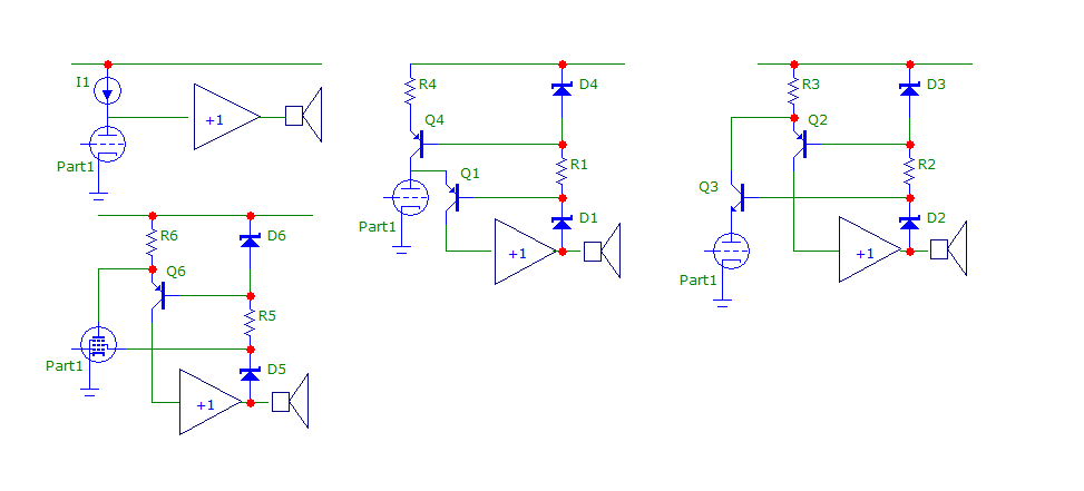 Любопытно, что при изменении точки съема сигнала (выход заземляется, а сигнал снимается с шин питания), каскад SRPP превращается в повторитель Уайта, а повторитель Уайта - в каскад SRPP! Без изменения схемотехники!