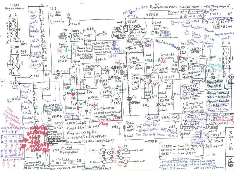 Сигнал со входа IN приходит на парафазный каскад Q6. При соблюдении условия R8=R9, между анодом и катодом верхнего и нижнего триода действует одинаковое напряжение раскачки и УН при этом сбалансирован.