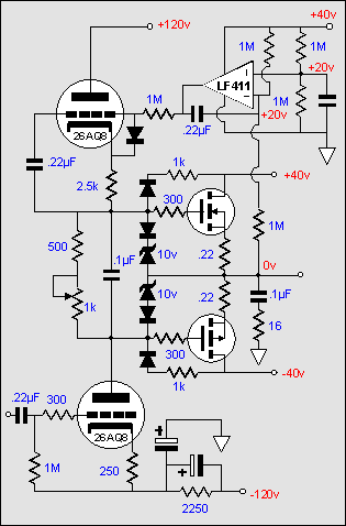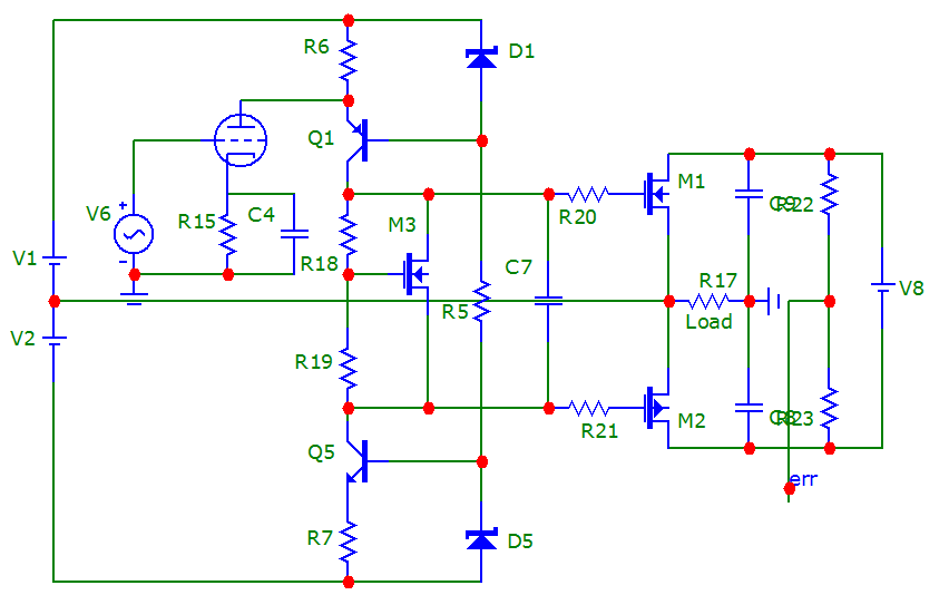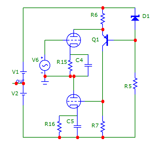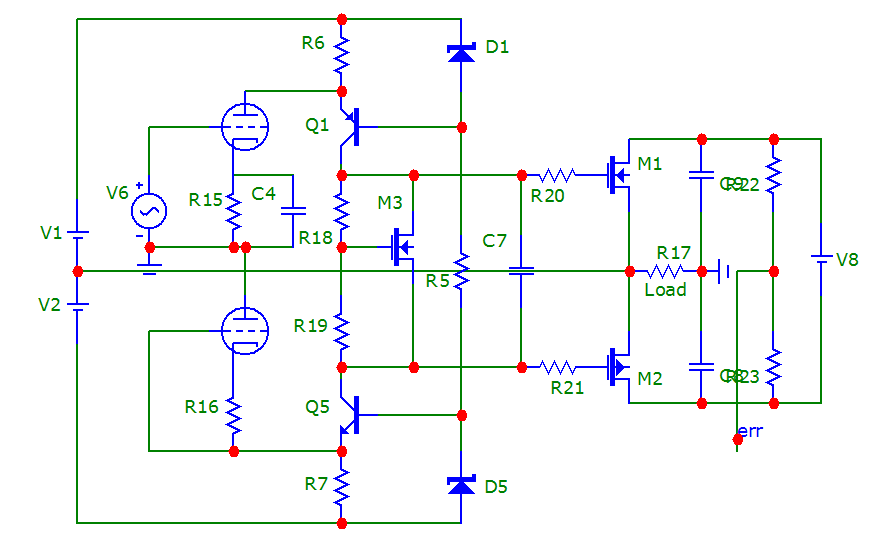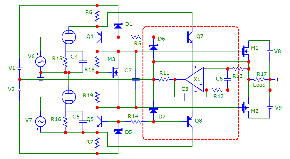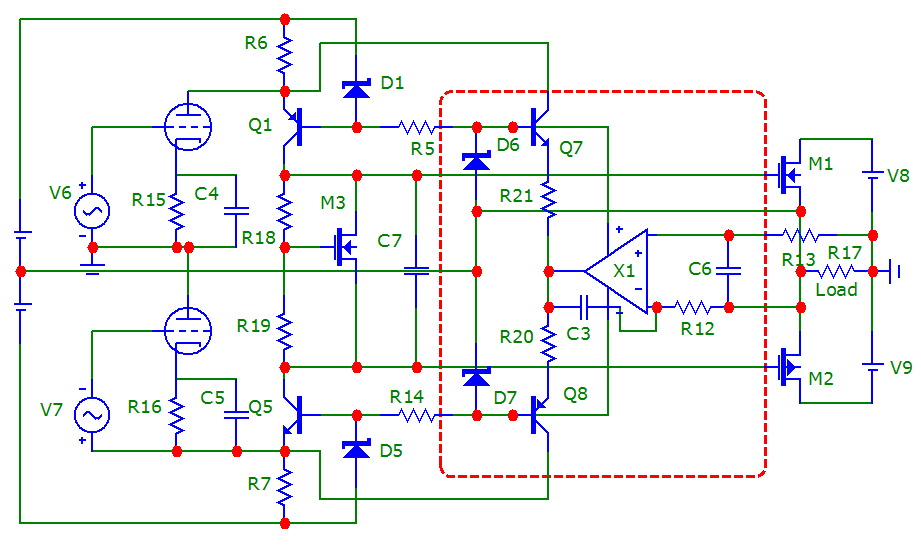 Двуполярный источник высокого напряжения V1 V2 для питания лампового УН тоже "плавает" вместе с выходом ВК, для того чтобы на эмиттерах ОБ сломанного каскода Q1 Q5 оказалось полное напряжение выхода ВК, и т.о. триоды УН будут работать в режиме холостого хода, а не короткого замыкания, что получилось бы, если посадить среднюю точку V1 V2 на землю. Режим холостого хода благоприятен для триодов, т.к. внутренняя ООС по полю (влияние напряжения анода на ток анода) проявляет себя во всей красе, создавая "триодный" спектр на выходе усилителя.