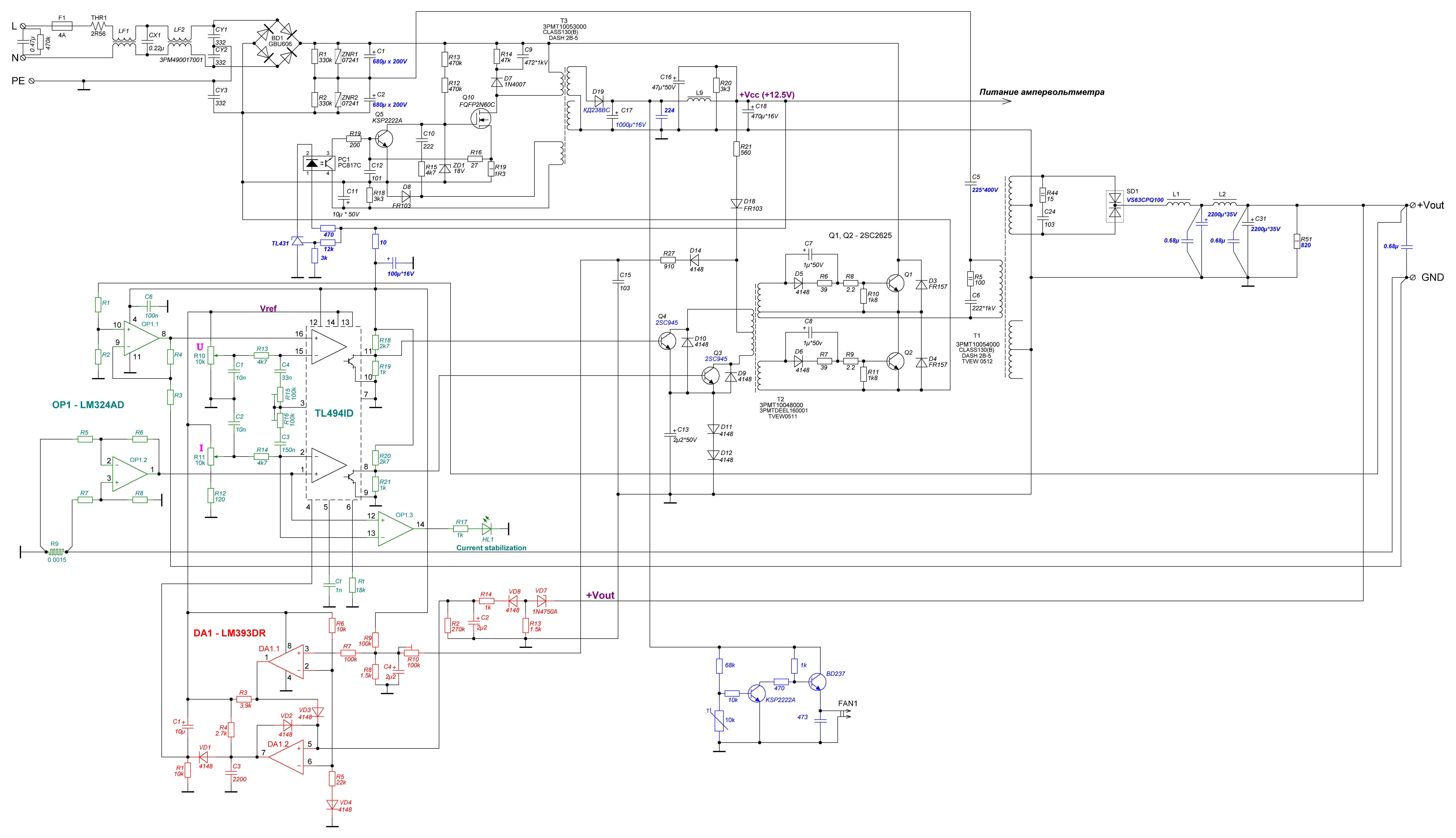 Решил сделать себе ЛБП на основе ATX-БП. Под руку подвернулся 350Вт InWin с ШИМом IW1688(оно же SG6105D). ШИМ был удалён, а вместо него установлен модуль с TL494 + LM358 + LM393 (полная схема - в прикрепе); перемотан ДГС, заменены электролиты в "горячей" части (все); ОС по напряжению в источнике "дежурки" реализовал на TL431. Регулировки: напряжение: 0-26В, ток: 0-20А (естественно, с защитой от превышения мощности).