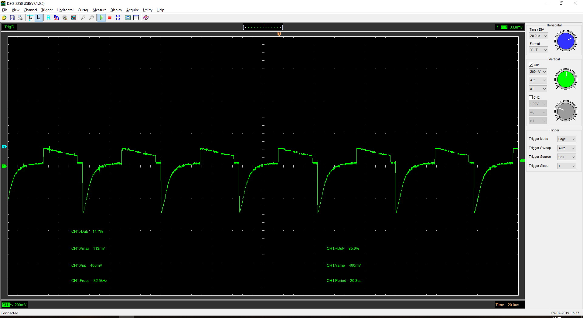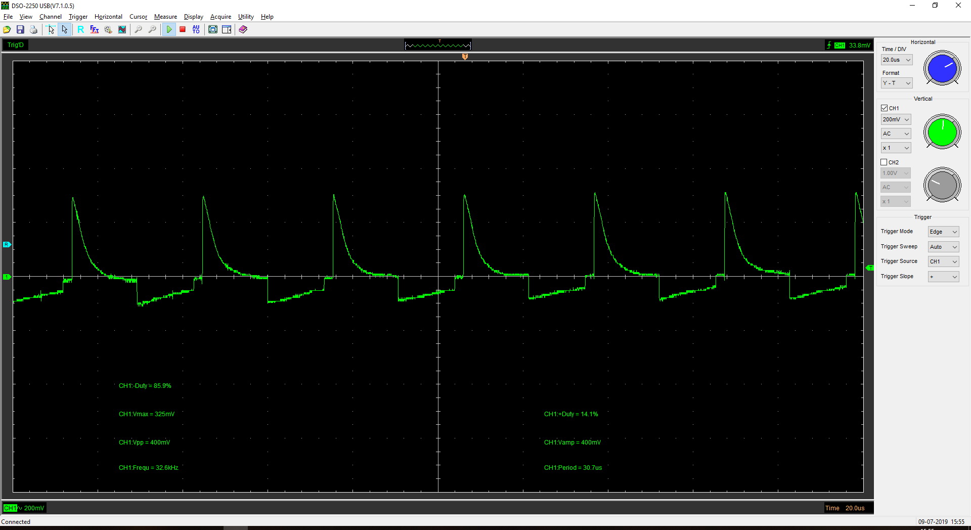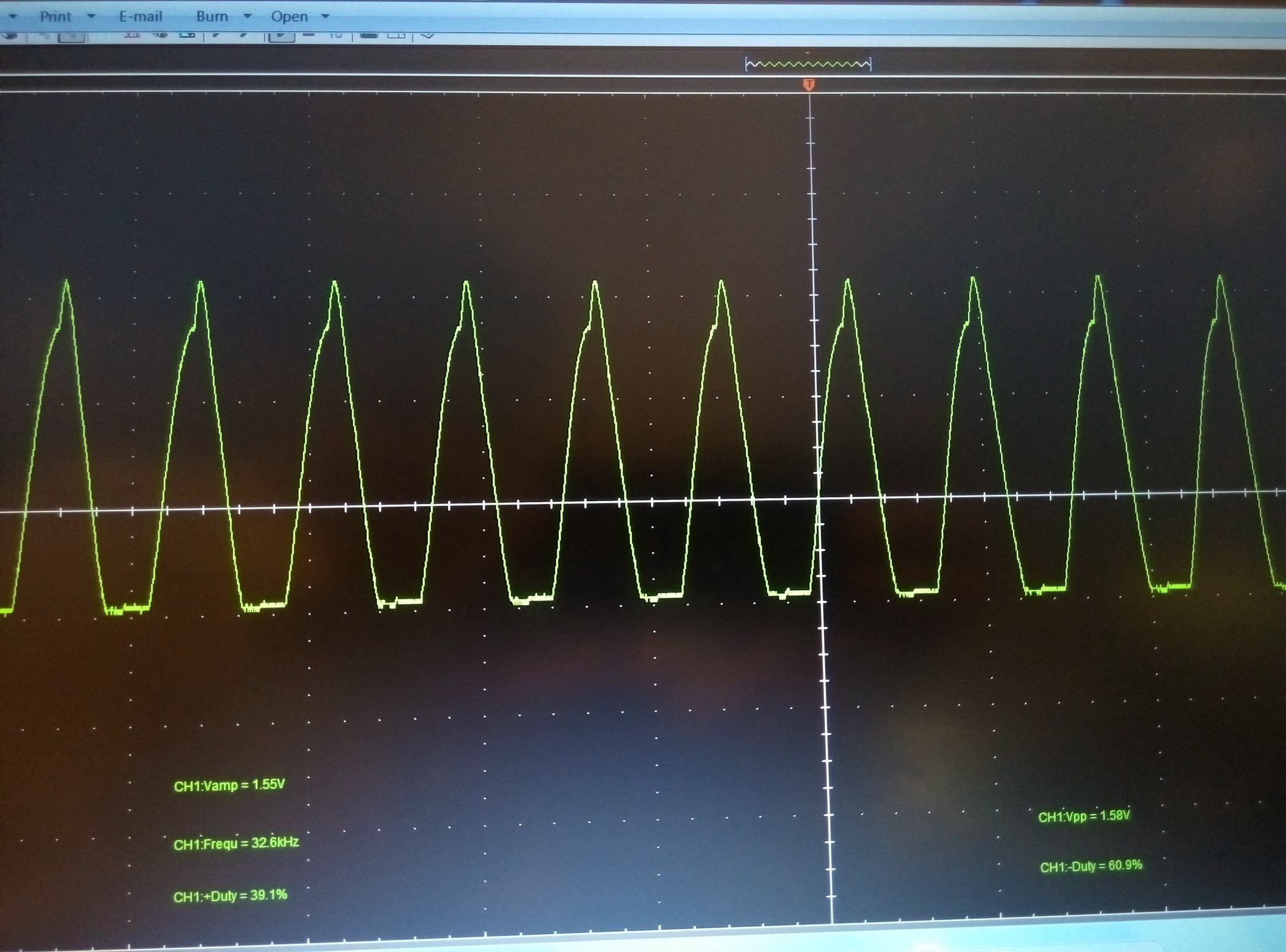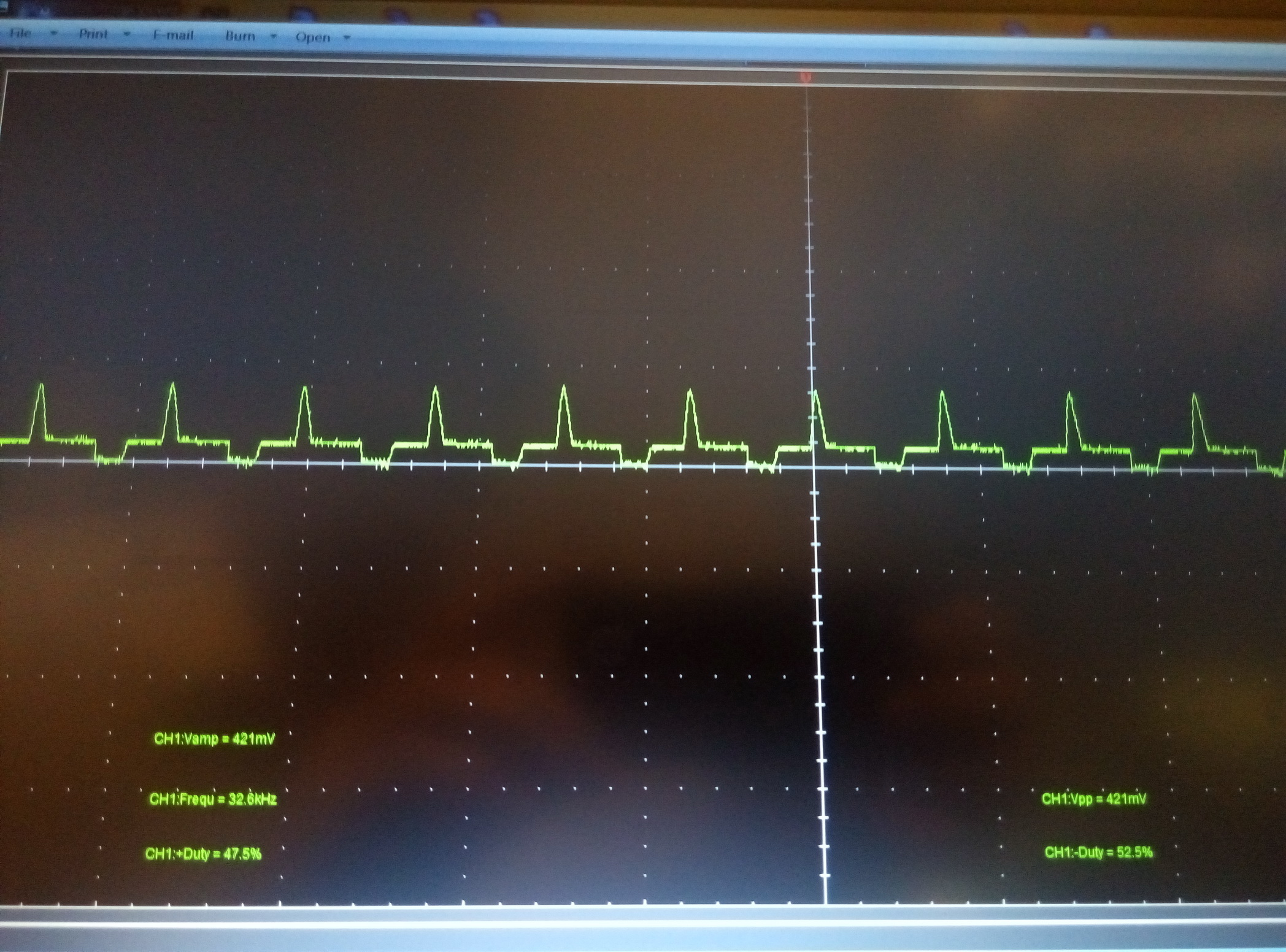 Запаял все компоненты, кроме силовых транзисторов Q1 и Q2, на место. Точку соединения R11 и обмотки Т2 - отцепил от "-", откинул C5. Подключил к выходу БП "Крону" и вращением регулятора Uвых добился появления импульсов на выходах ШИМ-а. Подключался осциллографом поочерёдно между базой и эмиттером силовых транзисторов (в случае с Q2 - между базой и точкой соединения R11,T2): осциллограммы ниже (Q1 и Q2 - соответственно). Осциллограммы у меня вопросов не вызвали - на мой взгляд, всё ОК.