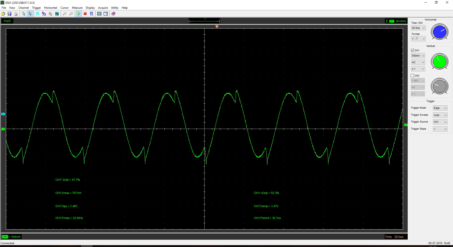 Собрал всё до кучи и снял осциллограммы с анодов выпрямительной сборки SD1 - осциллограммы ниже (D1 и D2 - соответственно). Тоже всё норм...