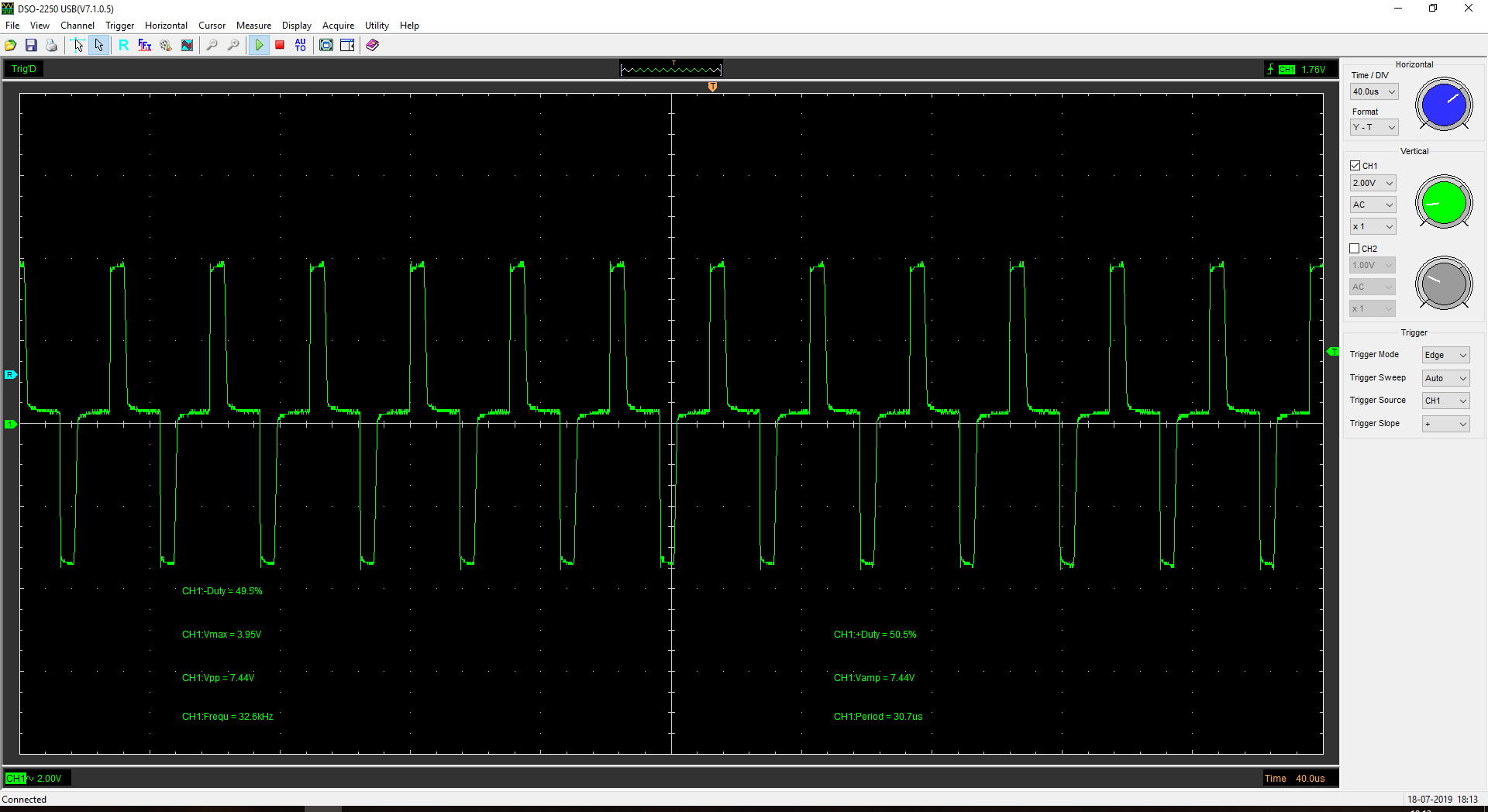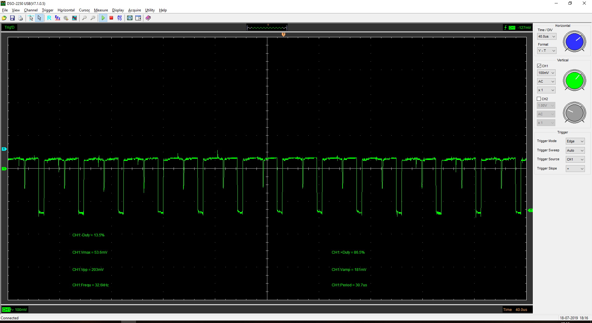 Амплитуда импульсов указана на осциллограммах: CH1:Vpp *10 (на щупе включен делитель 1:10).