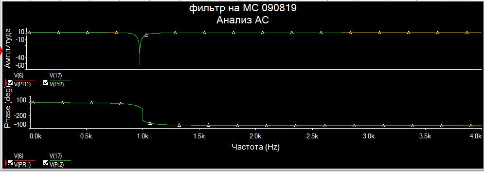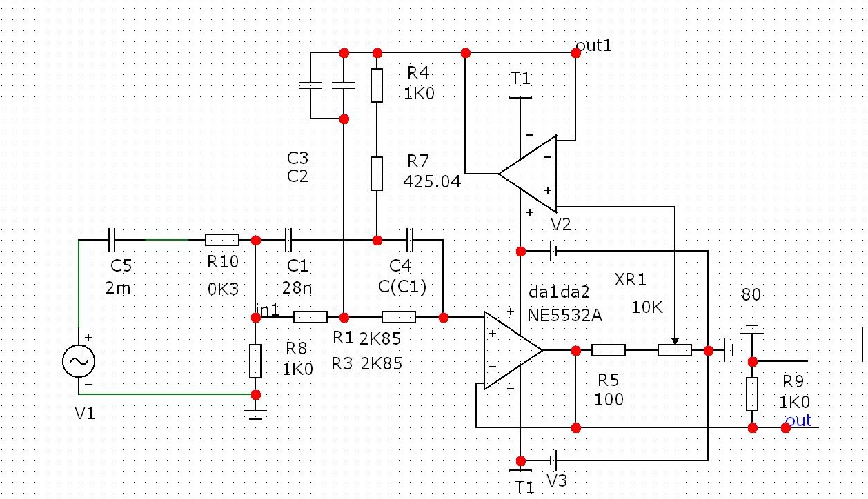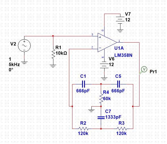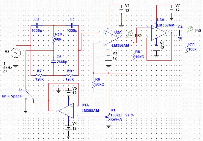 Есть фильтр на ОУ (см. схему). Подскажите, какие изменения нужно в нее внести, чтобы опустить "плечи" слева и справа от пика на первом графике (выровнять и уменьшить амплитуду до и после 2 кГц)?