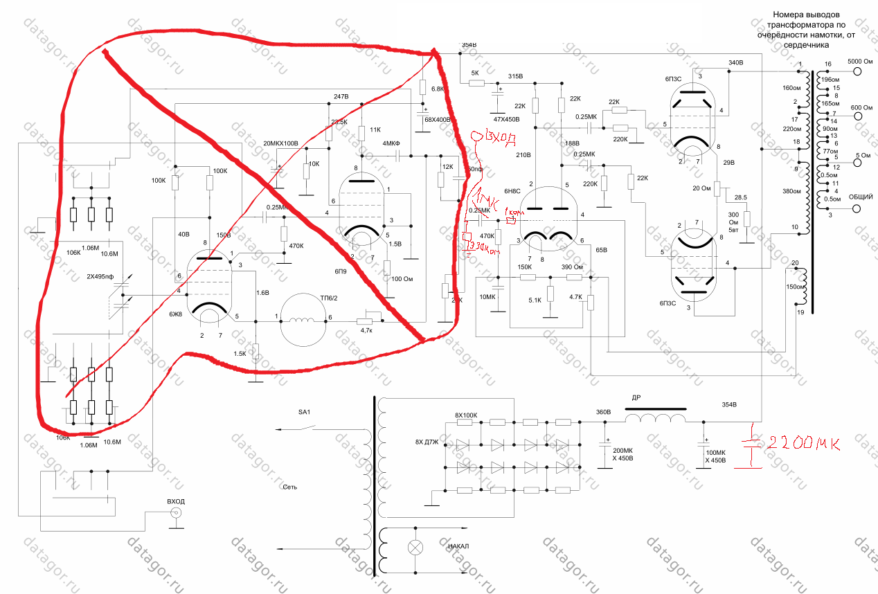 Искажения в цифрах не скажу, но на спектре все гармоники практически на уровень сигнала становятся. 20+20Вэфф - не понимаю, что это. Для подачи 5в могу использовать усилитель, в принципе его же могу использовать вместо транса в сеть, он у меня вольт 50качает без искажений. Напряжения проверял анодные - все в норме, так же в катодах 6п3с выставил равное напряжение падения на резисторе. В ФИ катодная обмотка это не относится с ООС? Делитель в сетках 6п3с 22к\220к он не сильно ограничивает сигнал? Хочу максимально подготовится к выходным для проведения работ. Так же еще не раскрыт вопрос по разности АЧХ каналов.