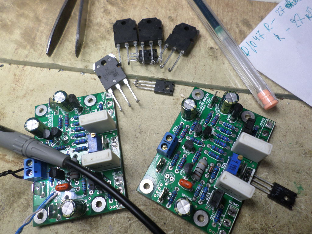 Сегодня проверю транзисторы, предварительно выпаяв. Беда в том, что обе платы звонятся практически идентично по сопротивлениям. Вешал тестер на объединённую массу и каждую деталь сверял на входе и выходе обеих плат. Микросхемки там вроде TL072, если я правильно понял, о чём Вы говорите. Я менял их, правда, тоже на китайские. Думаю попробовать проверить платы на более мощном питании 2 по 28 переменки, может, не хватает платам моего проверочного БП, на котором я всё делаю. Был опыт, когда по незнанию запустил без ничего 2 по 70 с 66 000 в плече... Искрило долго, пока кондёры не разрядились. Вот теперь и осторожничаю... Но начну с транзисторов...