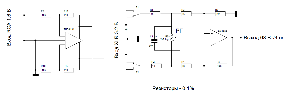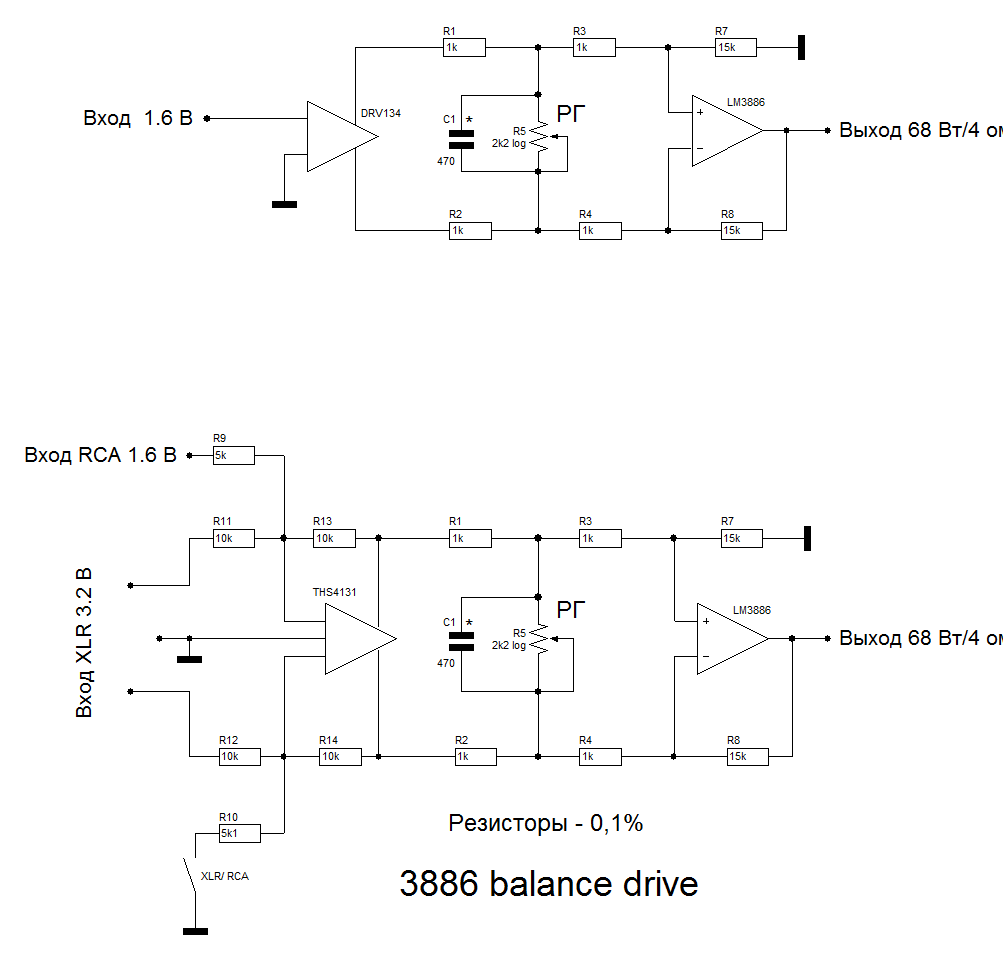 Подумал, что энтузиастов могут заинтересовать нижеследующие схемки. Тем более, что балансные источники сигнала появляются всё чаще (и это заслуженно). УМ в данном случаи включен по схеме сумматора балансного сигнала, поэтому уже имеет XLR-вход без дополнительного преобразователя и тут же РГ. Громкость регулируется внутри резистивного моста R1-4, что как минимум, снижает шумы и наводки по-сравнению с обычным вариантом. Резисторы нужны точные, 0,1% тонкопленка смд оптимальна.