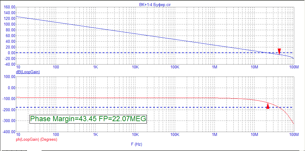 Как видно это симметричный УН + Интегратор . На входе УНа в качестве диф. каскада использована М1 - широкополосный быстродействующий с хорошей линейностью видео-драйвер НА5002 , представляющий из себя параллельный повторитель ( Кус=1 ) . УН получается по схеме ОЗ (в М1) - ОБ и симметрично нагружен управляемыми ГТ , создающими высокоомную нагрузку , а следовательно обеспечивающими максимальный Кус этого каскада . Для согласования с ним далее используется каскод Хауксфорда с Mosfet-ом на входе с током покоя около 30 мА . Ну и на выходе истоковый повторитель , с выхода которого токовая ООС через делитель задающий Кус заводится на второй вход ( выход М1 ) диф. каскада.