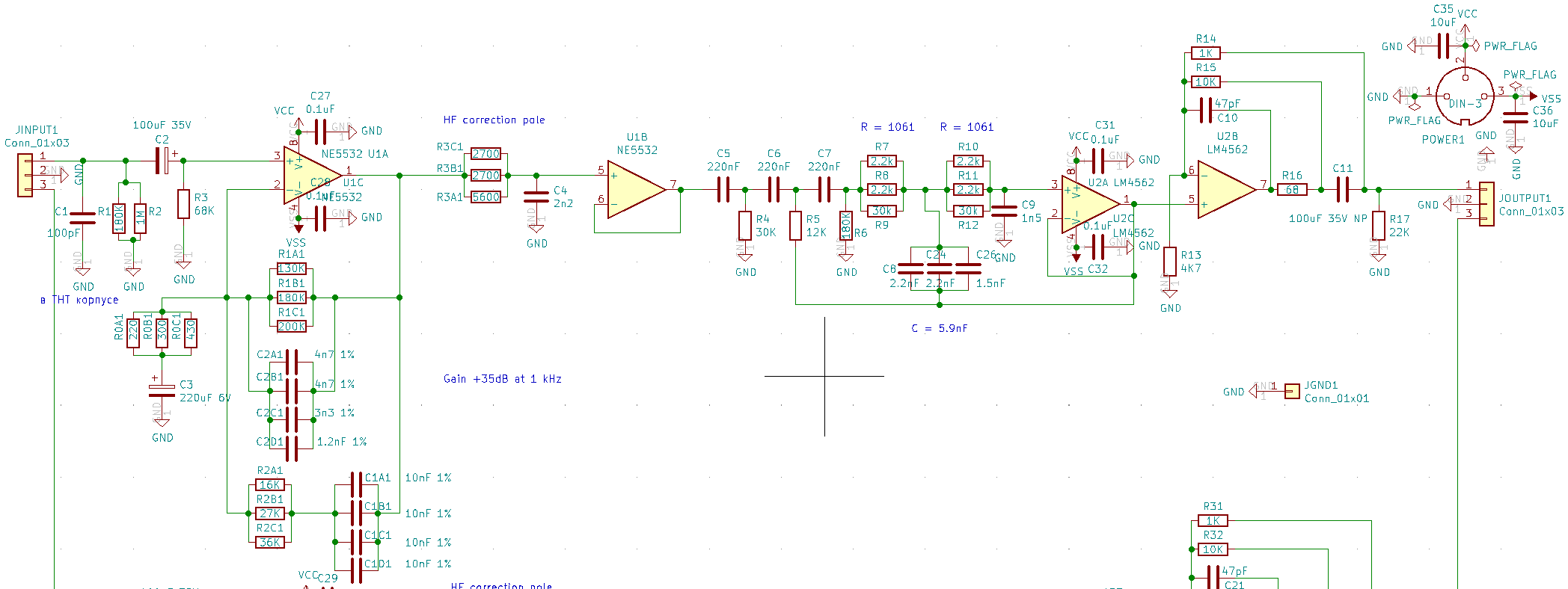 ОУ используются самые обычные NE5532, кроме последней стадии. Там низкое входное сопротивление NE5532 может быть помешать, и поэтому как вариант можно использовать TL082 (но у него THD около 0,02), или же как более точный, но по прежнему недорогой вариант ADA4075-2. Я осведомлён, что на рынке существует уйма "аудиофильских" усилителей, но их использование не целесообразно с инженерной точки зрения. Уровень шума у 5532 уже ниже того, что вносится сопротивлением обмоток иглы, а уровень вносимых гармонических искажений ниже 0.001%, что ниже порога разборчивости человеком. В общем, более дорогие ОУ это крайне сомнительное улучшение, но весьма конкретное удорожание