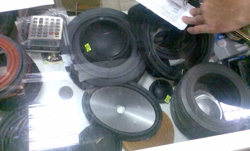 Но главное - прилавок! Фотографировал на телефон, поэтому плоховато видно. На нем: центрирующие шайбы, резиновые подвесы, алюминиевые и бумажные диффузоры разных форм и размеров. Местные ребята сказали, что при необходимости корзину выштампуют. Катушки само собой - мотают.