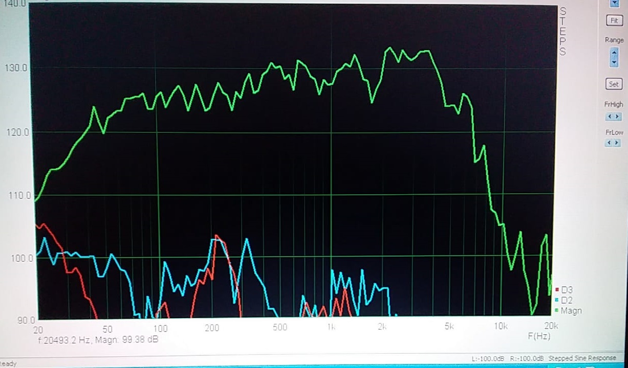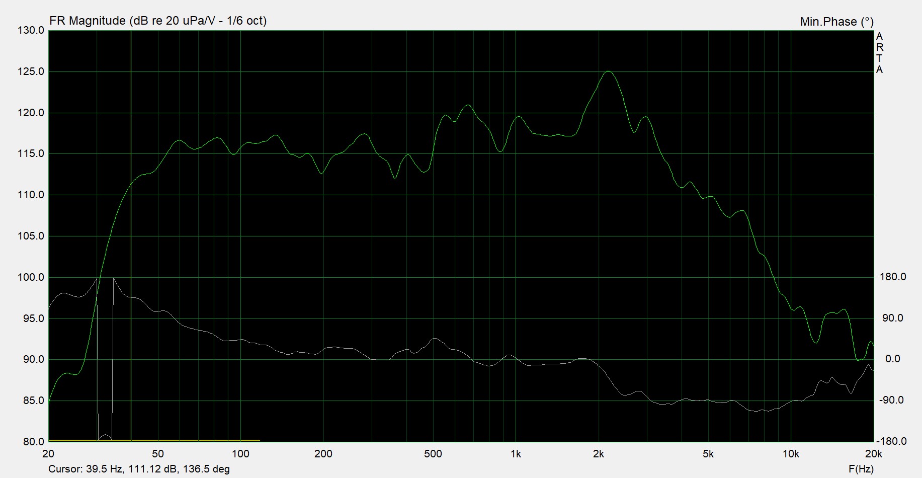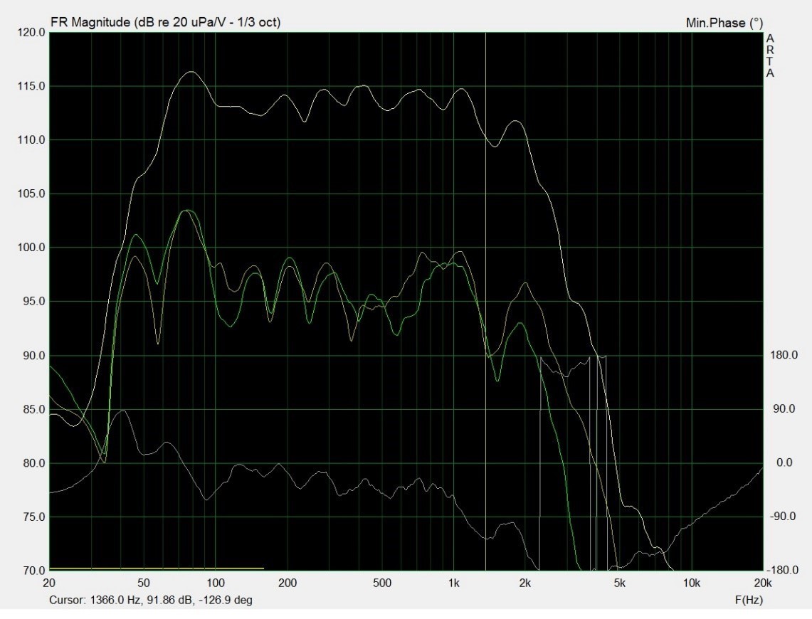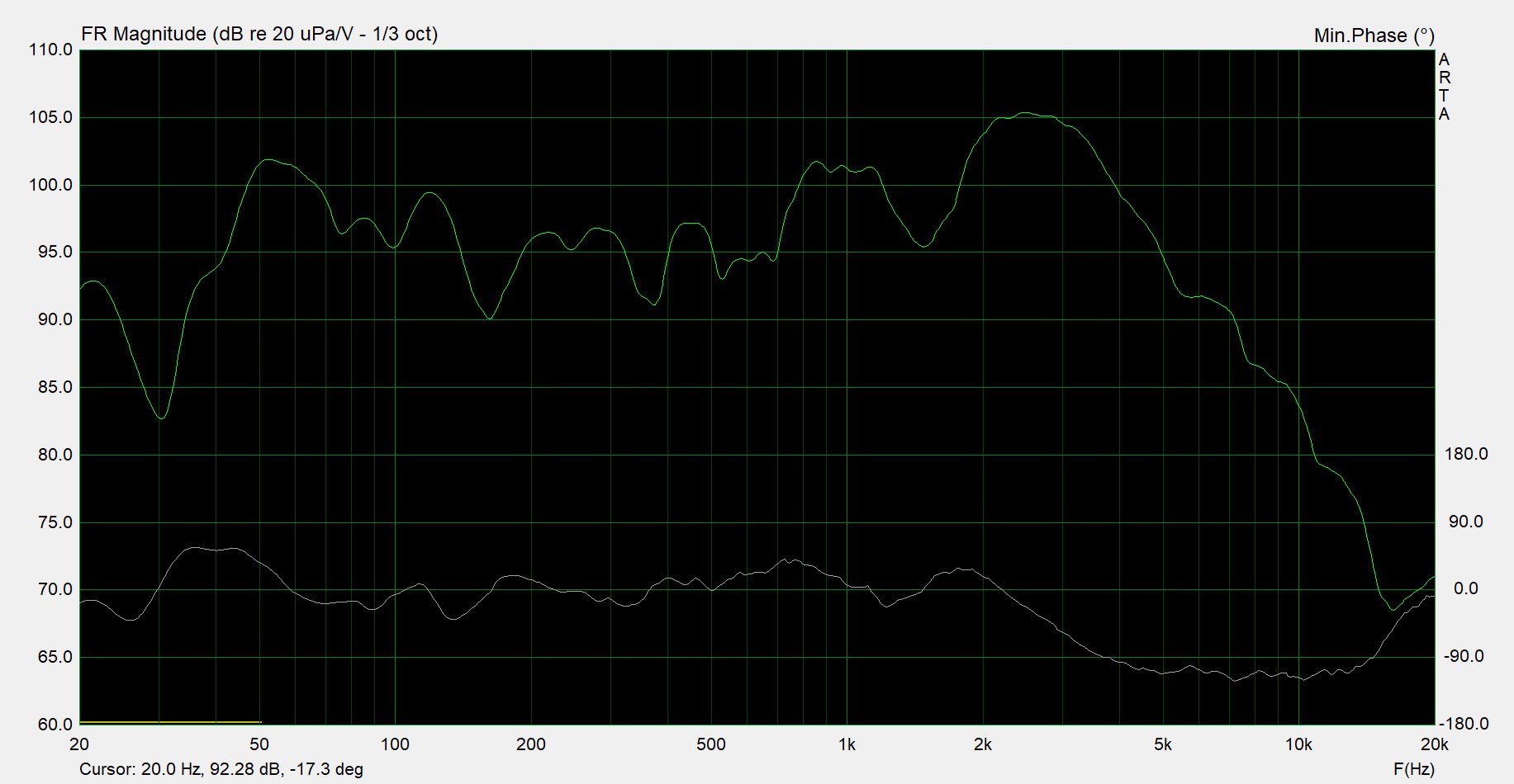Вот новый в оформлении, на полу ковры в два слоя, измерение 2 метра с хвостиком, примерно 15 градусов от оси. Ширина корпуса АС около 45 см. Отлично чувствуется баффл стэп. Уже чувствуются отражения от стен, но не катастрофически. И после 2к направленность уже очевидна. За счет новой целлюлозы, диффузор стал жестче при той же массе и АЧХ немного подправилась.