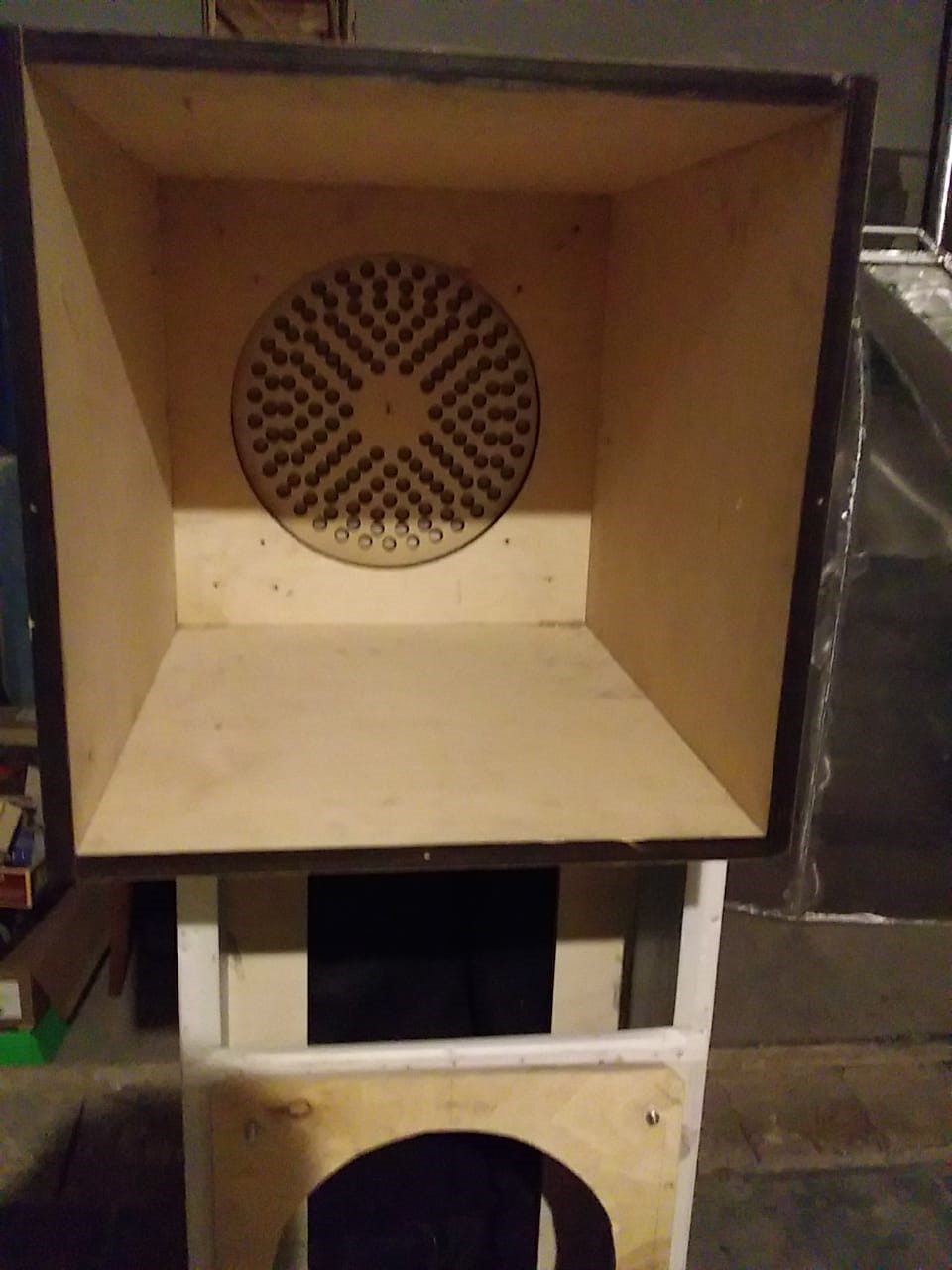 После нескольких экзотических экспериментов с H фреймом и ЗЯ, мы вспомнили и реализовали старую добрую идею ПАС или вариовента. Спереди крепится панель с динамиком, а сзади в отверстии под 15 дюймовый динамик))) панель ПАС из двух 8мм панелек фанеры с кучей отверстий (80% от площади 12 дюмового НЧ кажись) и между ними зажаты два слоя натянутых пластов ватина. Пик импеданса получается один, растянутый и сильно зажатый снизу. Фото импедаса ПАС не осталось.