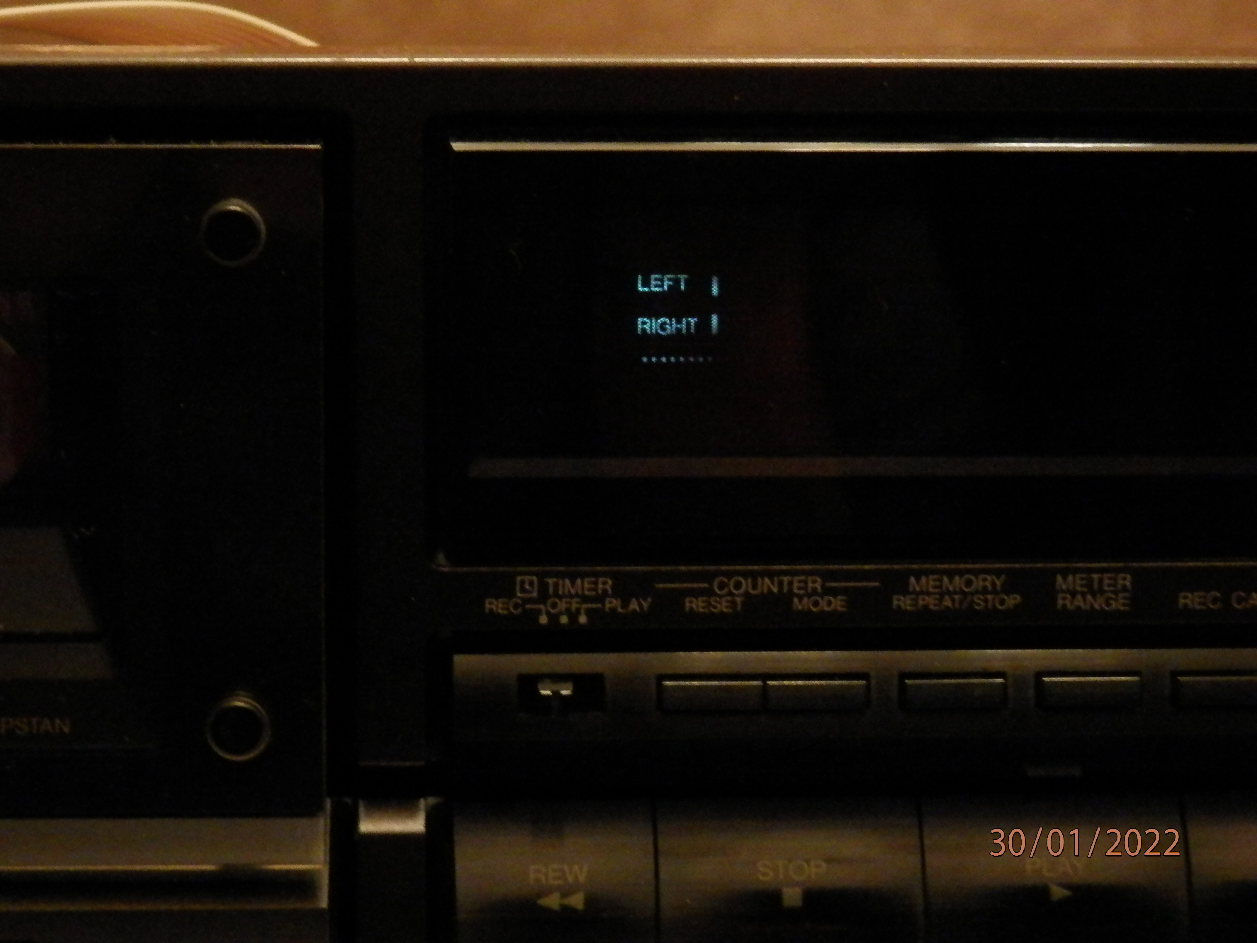 Работала нормально около 2-х часов. Вышел из комнаты минут на 15. Когда вернулся то уже "молчала", дисплей затухал, головки и ролики в ЛПМ остались в "рабочем" положении. Выключил из сети. Теперь при включении только светятся вполнакала левый и правый канал (надписи).