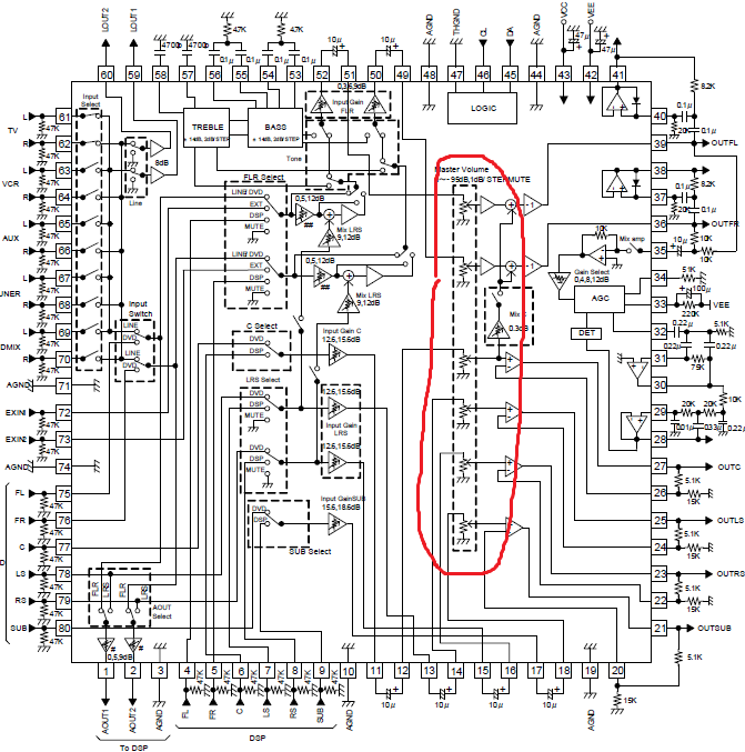 Но, наверно, кроме всего этого еще идет и закрытие каналов на паузах и остановках. Заметил следующее. Поставил диск Аватар и смотрю какой то фильм с ТВ приставки со звуком 5.1 через кинотеатр. На DVD Аватар есть в начале циклический кусок, на котором на фоне кадров из фильма активные надписи типа "играть", "настройки". И этот кусок постоянно циклится. В момент перехода головки на начало цикла поток видео и аудио секундно прекращается. Синхронно пропадает и звук в динамиках. Если я нажимаю "играть", то начинается постоянное воспроизведение и звук в динамиках воспроизводится в течение часов трех совершенно нормально. Значит, получается, что при отсутствии видео или аудио (точно пока не понял) потока идет закрытие каналов звука. Это место на микросхеме обведено красным.Нажмите на изображение для увеличения.