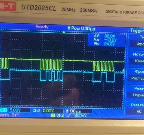 А вот такой сигнал STAT при выключенном и включенном воспроизведении. Он синий. Желтый CLK, такты.Нажмите на изображение для увеличения.