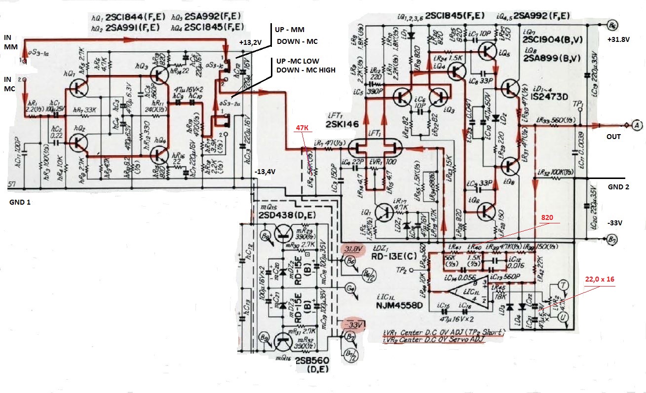 Посмотрите на схему Sansui - разделительные конденсаторы присутствуют только в дополнительном каскаде для МС головок.