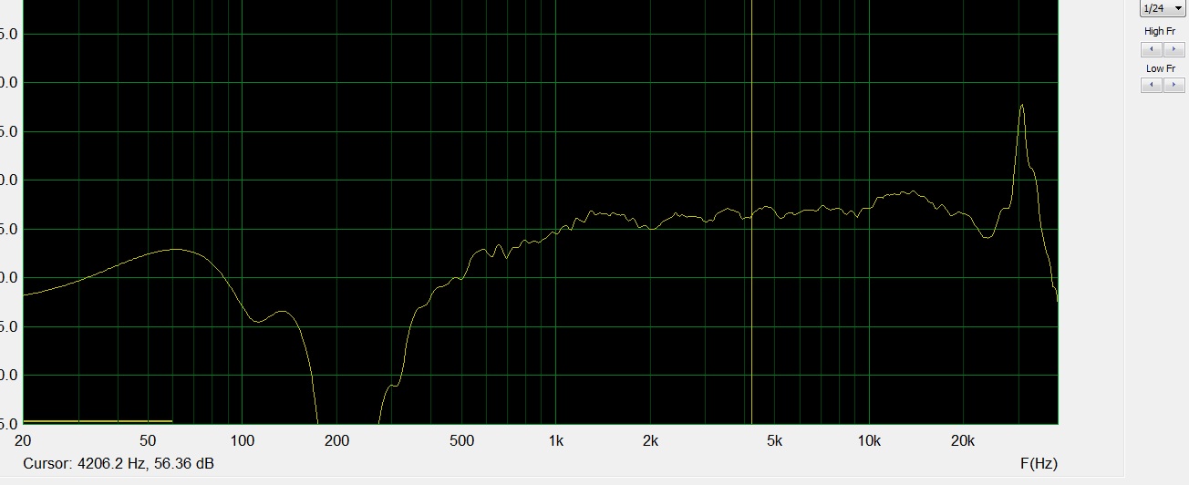 Вот замер колонки с керамическим мелодавид фланец 110мм. Замер с 1 метра прям по месту как на фото. Окно по умолчанию (500мс), сглаживание правда 1/6. Микрофон умик 1дсп. Сведено не окончательно прим на 4-4,5кГц. Так что можно еще ровнее сделать. Но это потом.