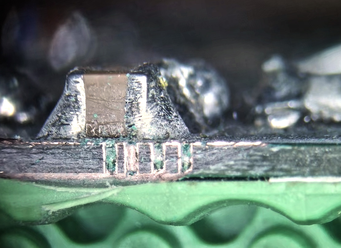 Вот, я сфоткал для вас, дрожащим телефоном в Nikon SMZ660 что-то из хлама, FR4 1mm 2oz Via .5mm.