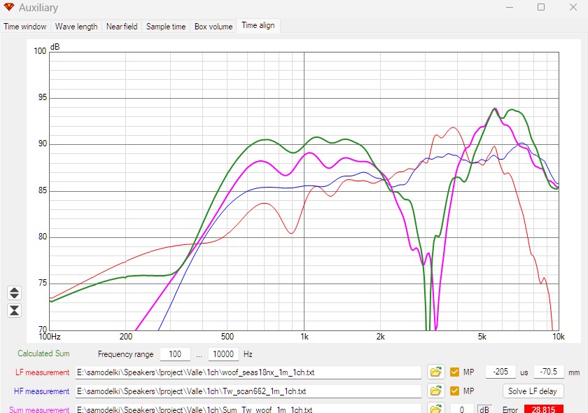 9. Переходим в программу VituixCAD, открываем меню Tools – Auxiliary, открываем закладку Time Align и начинаем творить мейджик – будем находить задержку. В поле LF measurement загружаем АЧХ вуфера, в HF measurement - АЧХ твитера и соответственно в Sum measurement - суммарную АЧХ вуфера и твитера. Ставим галочки в МР т.е. из измеренной фазы генерируем минимальную фазу.