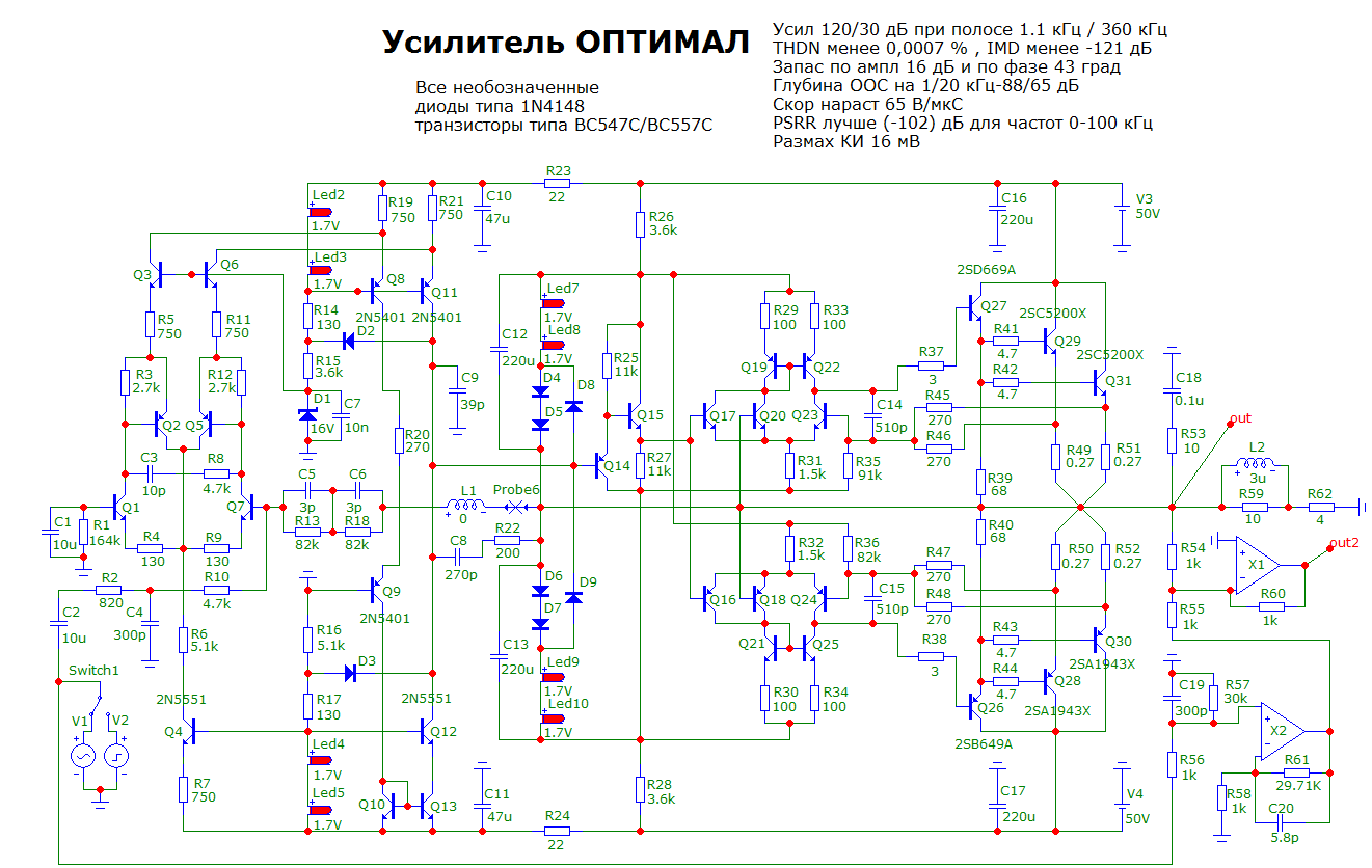 Общие комментарии к схемам следующие. Усилители напряжения на базе дифкаскада обеспечивают необходимое усиление (120-150 дБ) при минимальных искажениях и почти нулевой чувствительности к пульсациям источников питания (-100дБ). Ноль на выходе усилителей лучше +/- 5 мВ обеспечивается при подборе входных транзисторов с разницей h21 менее 3 %. При невозможности подбора можно ставить вместо эмиттерных - переменные резисторы близкого номинала и настраивать ноль вручную. В схемах ИДЕАЛ и СУПЕР-2N входные транзисторы могут быть и полевыми без ухудшения характеристик усилителя (подходят полевые транзисторы 2N7000, КП303,307 и подобные). Транзисторы в дифференциальных парах предвыходных детектирующих дифусилителей рекомендуется подбирать из одной партии с разбросом h21 менее 10 % (а таких обычно более 70 % в партии). Подходят транзисторы ВС546-ВС556 с буквами В и С и располагать их как можно ближе друг к другу или даже покрывать герметиком. Ещё лучше использовать SMD элементы (рекомендуются сборки BC847BPN, BC846BPN-SOT363 и обычные транзисторы BC846,BC856,2N5551,2N5401 - SOT32). Форумчане, надеюсь, придумают печатку для SMD варианта и поделятся с народом. Высококачественный усилитель без настроек и без танцев с бубном вокруг термостабильности! Рекомендую!