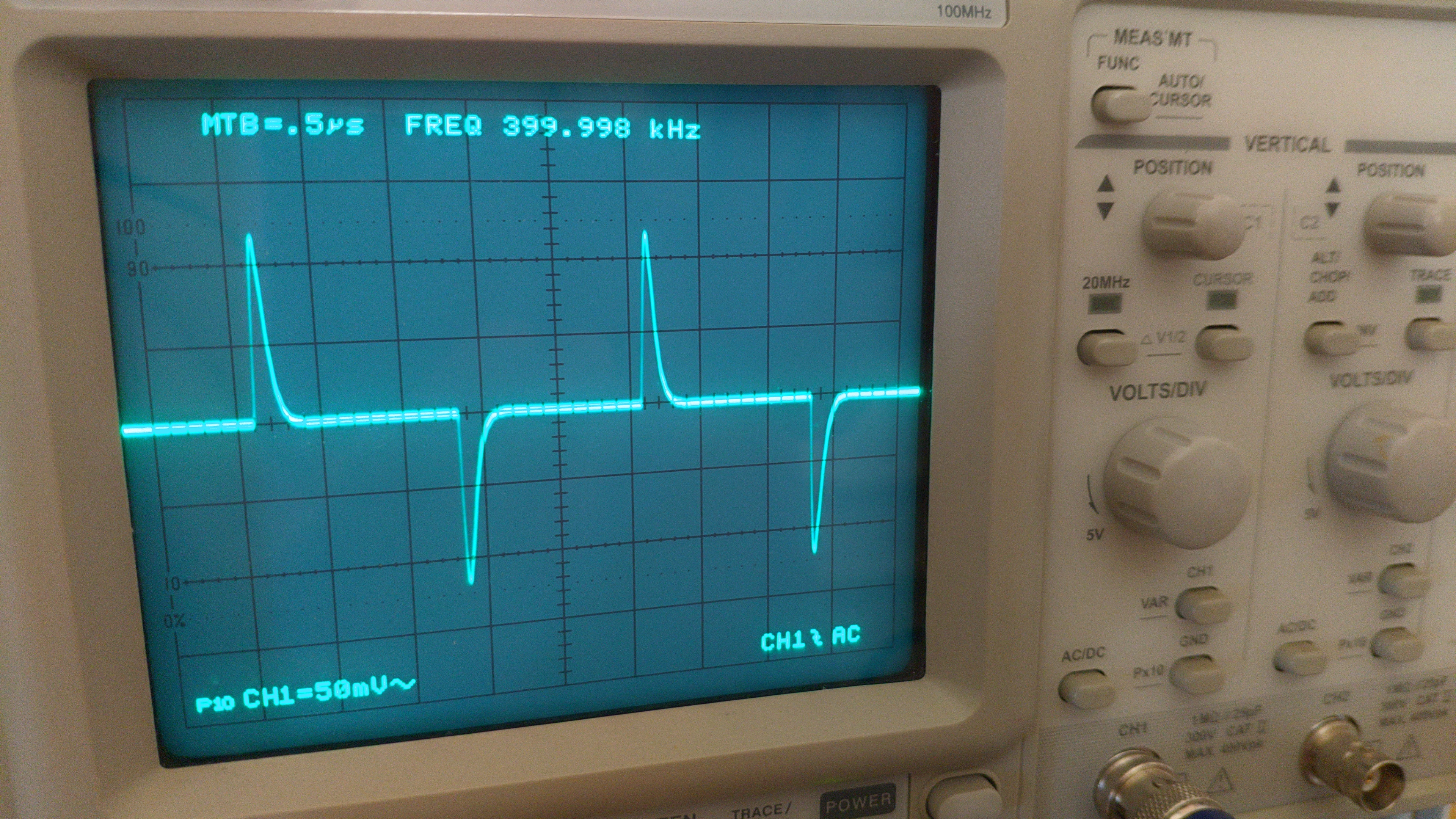 Решил ради интереса сделать некий прототип каскада ток-напряжение на оу(кр544уд2а) , на генераторе меандра частота 800кгц (почти 16Fs), схема, источником тока выступает резистор 760 Ом. 1- щуп осциллографа(X10) сразу с выхода генератора