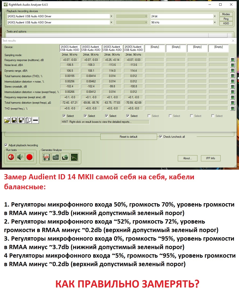 Сделал тесты в REW и RMAA + всё подробно на фото писал - какие настройки железа и т.д.