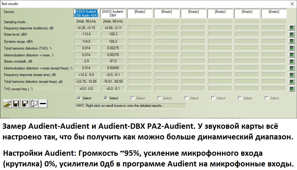 У DBX 50кОм, а у Audient 2.8кОм. По этому карта сходит с ума при замере самой себя на макс громкости без усиления по входам.