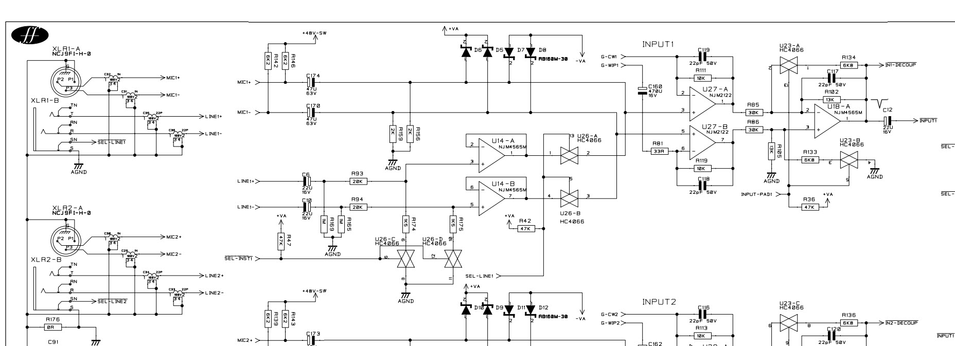 Кстати, вот на Факусрайт схема входной части. При переключении с инструментального на линейный вход чуйка меняется примерно на 20дБ. (делитель 20/1,5кОм)