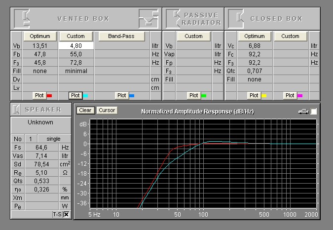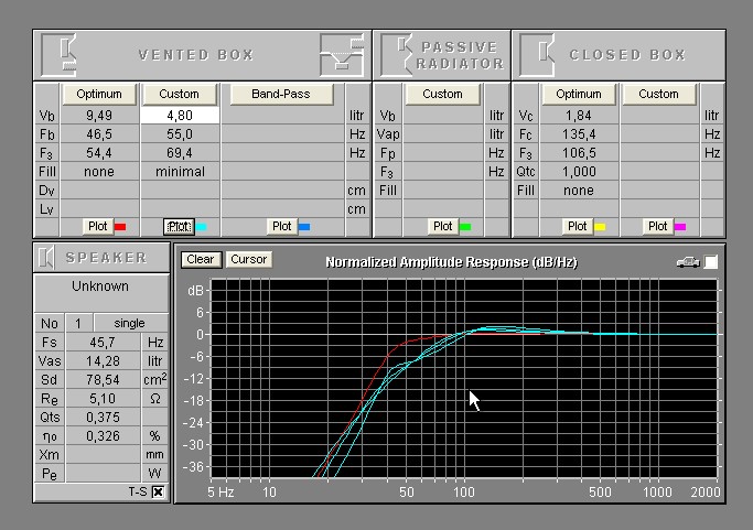 Итого, у меня есть динамик с этими характеристиками, есть корпус 4,9л и порт с частотой 56,7Гц. Динамик имеет некие новые характеристики, которые отличаются от оригинала, что было в оригинале узнать невозможно.