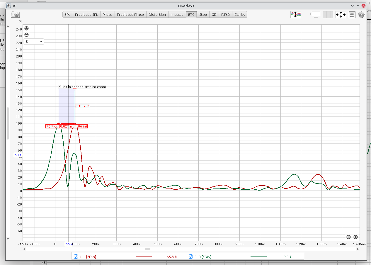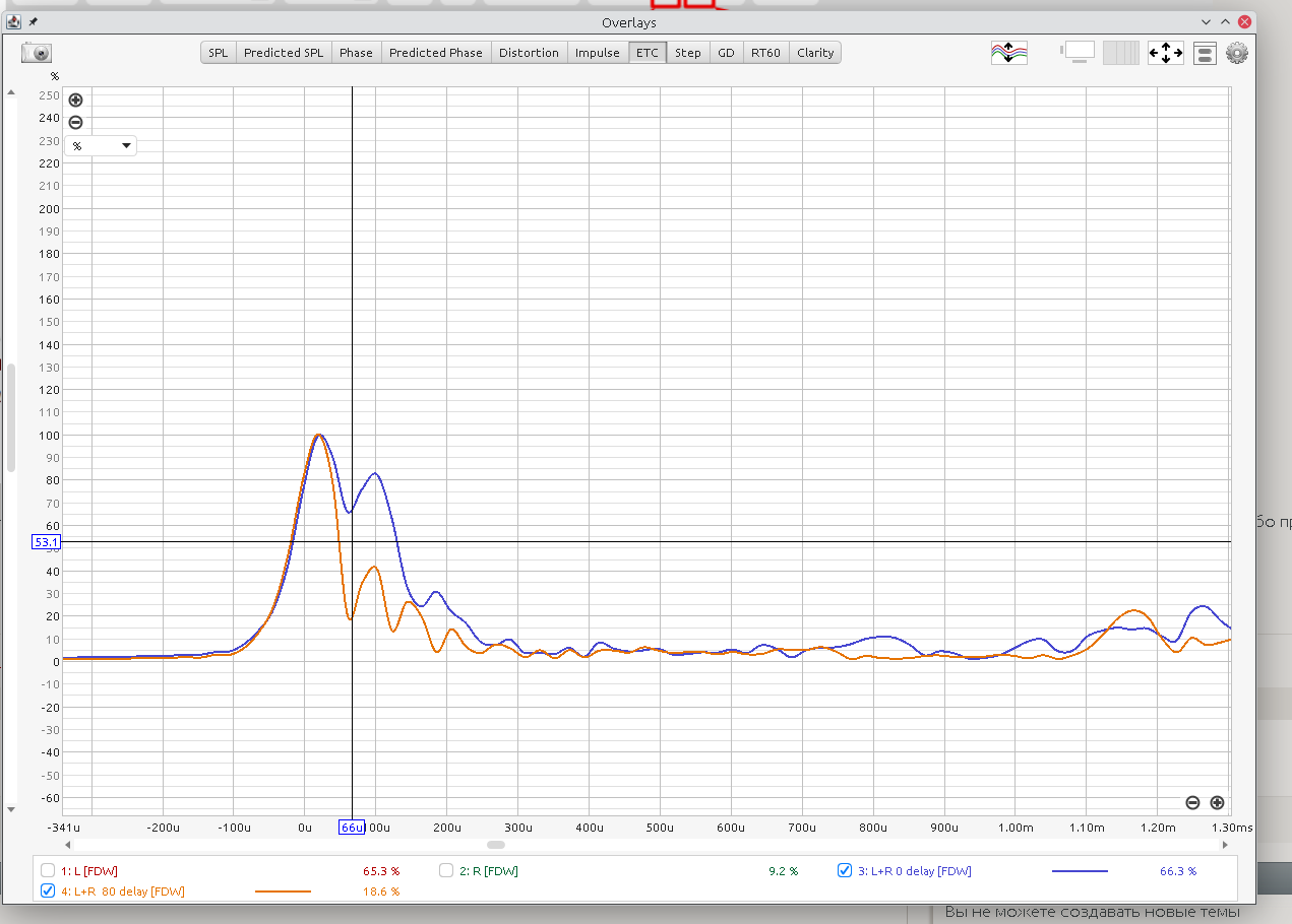 пробовал с "use acoustic timing reference" и во всех измерениях использовалась один и тот же референсный канал, если левый то 70ms для левого канала. а если за референс брать правый, то 80мс и уже для правого. так же "no timing reference" при совместном измерении показывал двугорбый импульс с разницой порядка 72мс. пытался ограничить свип-тон 1000-20000, что бы исключить нч - результат тот же.