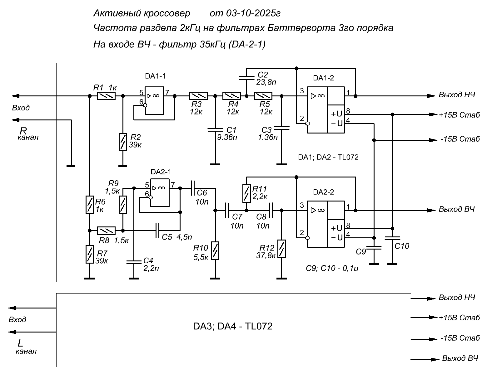 Изготовил комплекс полного биампинга на основе двух усилителей УМЗЧ и приставки — активного входного двухполосного фильтра — кроссовера.