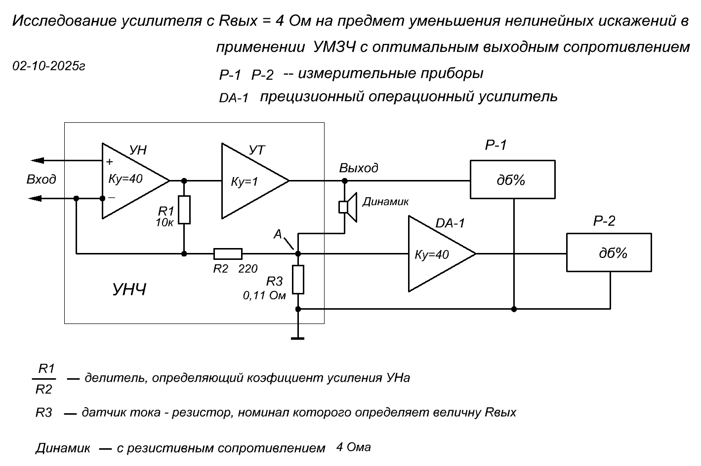 Связи с этим, показываю измерительную схему с помощью которой можно доказать уменьшение искажений при токовой ОС.