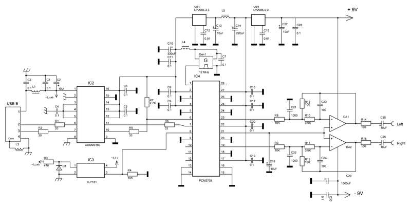 Пришла мысля - использовать изолятор ADuM4160 (он у мну есть, поэтому). ЦАП - РСМ2706 его качества мне вполне хватает для обоих применений (естественно с приличной аналоговой обвязкой). И хоцца, чтобы это его исходное качество не пострадало от изоляции. Как и возможность подключаться к Винде без установки драйверов - это первостепенная задача. Если дрова для ЦАПа на Винду придётся накатывать (я так понимаю, что не придётся, но всё же) - то и начинать не нужно. Судя по обзорам готовых устройств, снижаются шумы ЦАПа - но это я так понимаю, что ихние ЦАПы питаются от USB и возможна недостаточно качественная фильтрация питания.