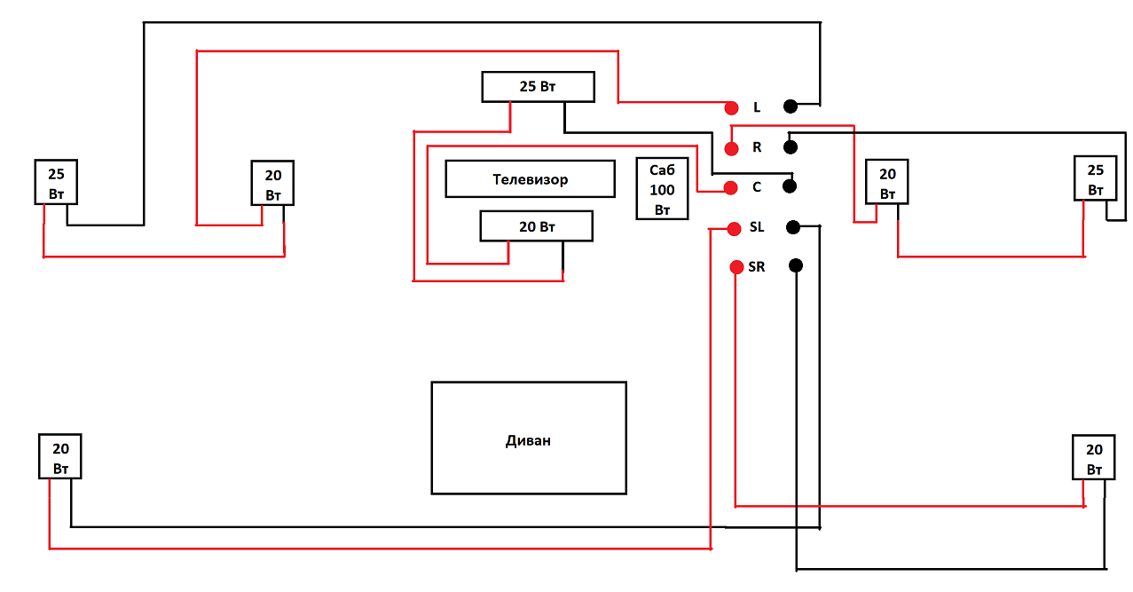 Я хотел бы сделать что-то на подобии 8.1, последовательно подключить каждый фронтовой динамик с колонкой 20 Вт (ниже я предоставил рисунок, как я хочу это сделать). Так-же предоставлю характеристики обеих систем.