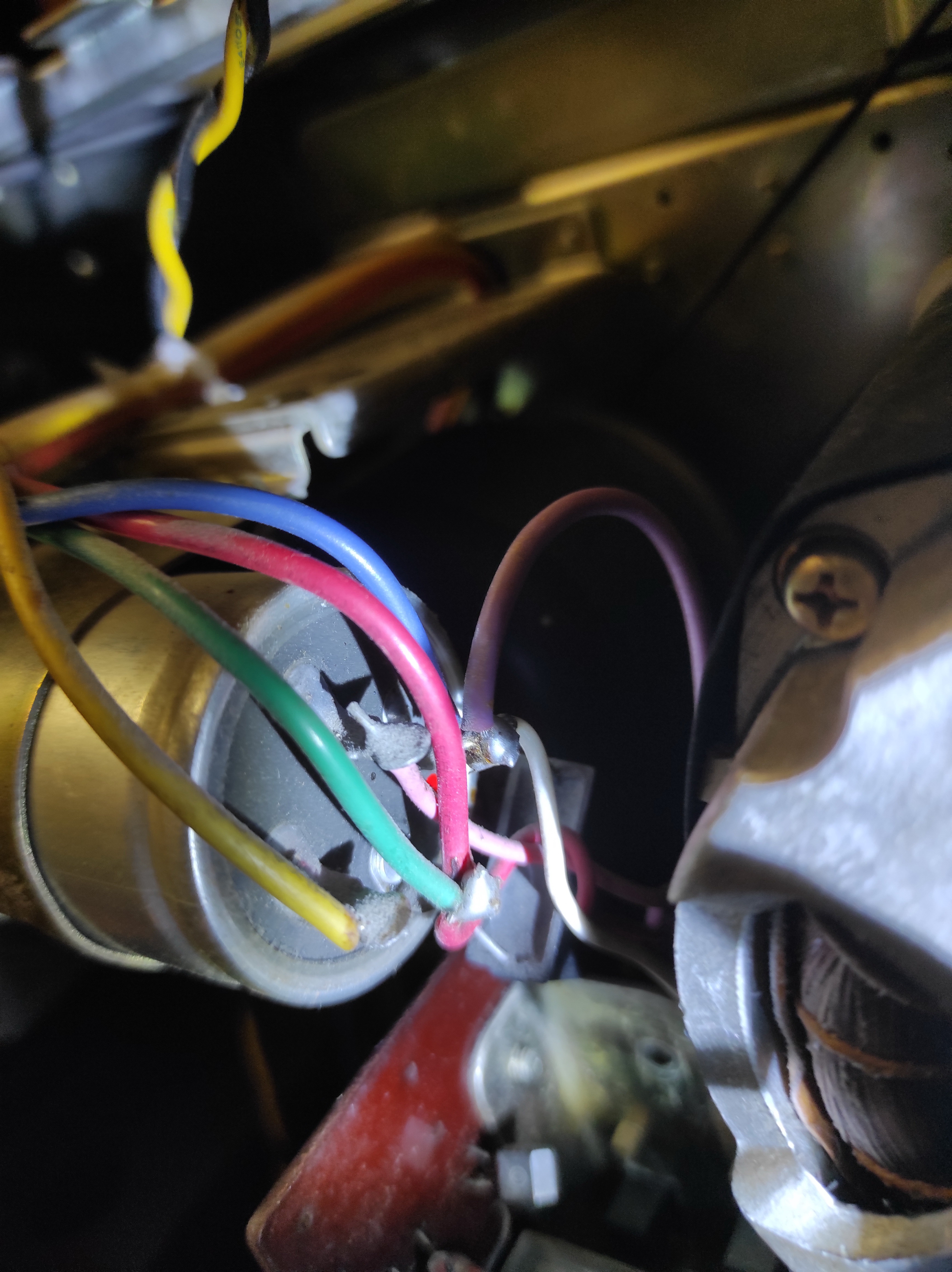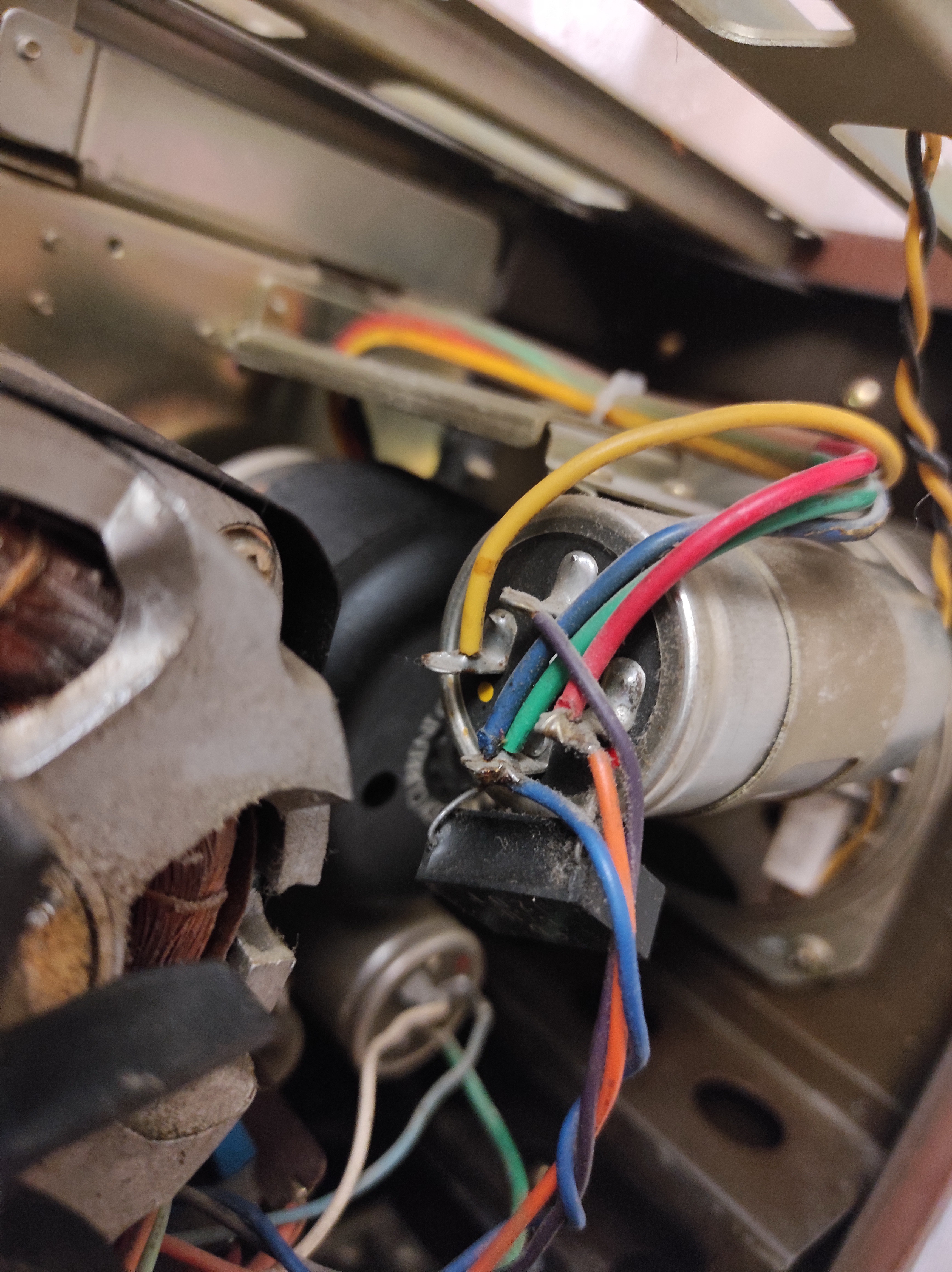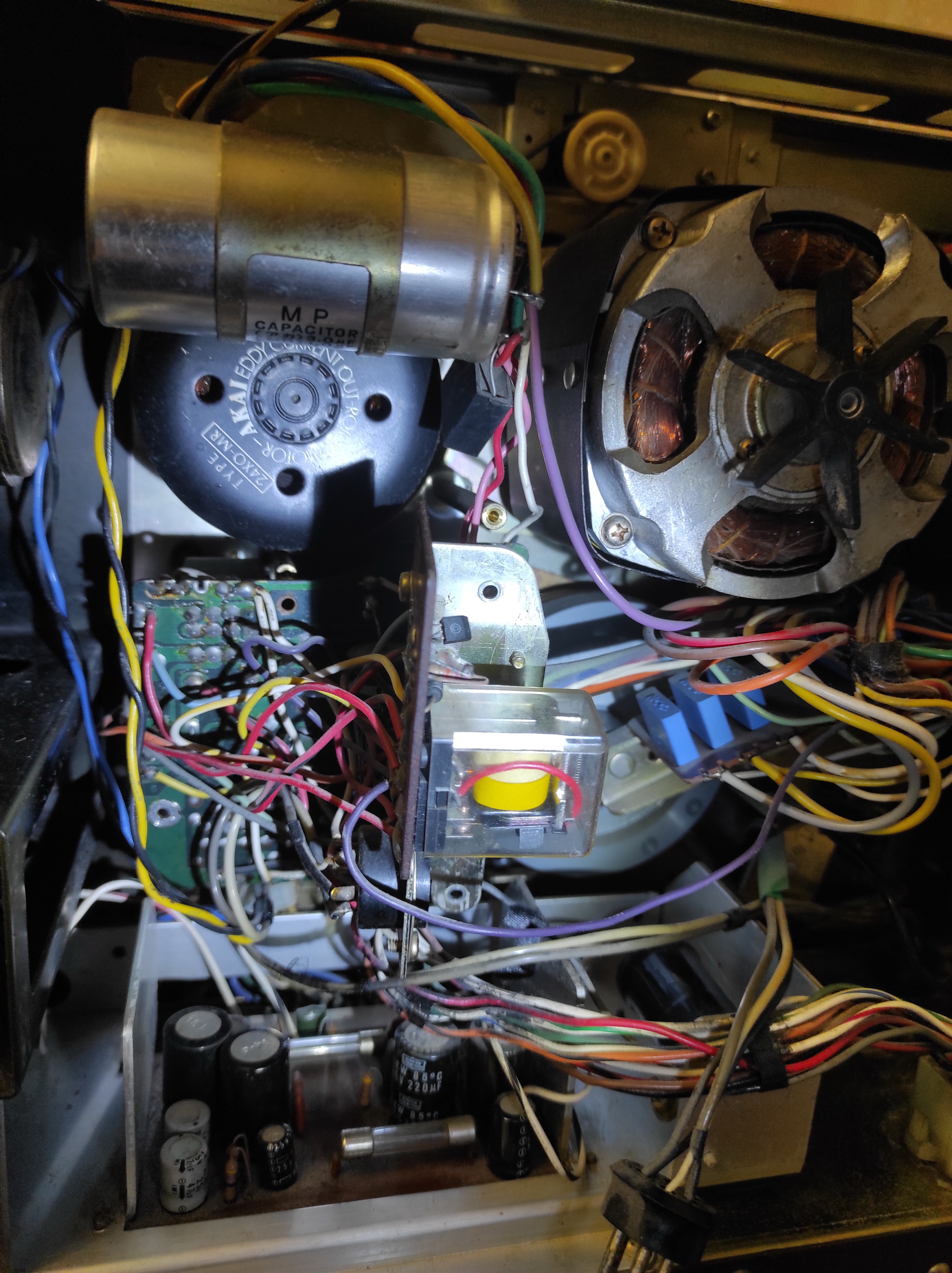 Замерял напряжение (мерял на больших конденсаторах, к которым идут провода от моторов, между жёлтым проводом и зеленым с розовым на принимающем двигателе и между жёлтым и синим с зелёным на подающем двигателе). Получилось так: в режиме воспроизведения 120 В на принимающем и 60 В на подающем, т.е. в 2 раза больше, чем указано в инструкции. И около 150 В в режиме перемотки.